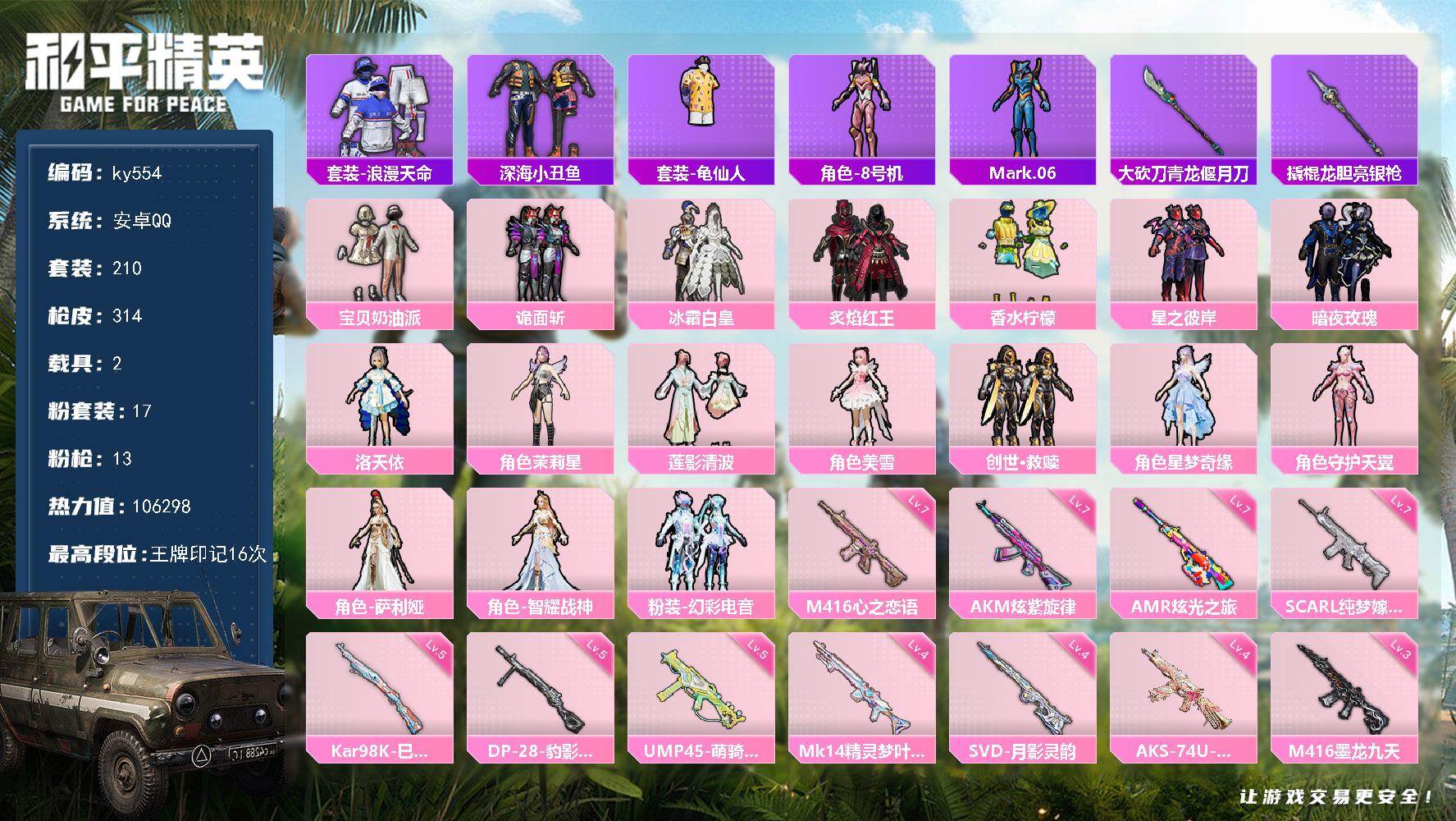 [17210051]安卓 手Q-17粉装-13特效枪-2载具-12粉色飞行器-106298热力值-16王牌印记-210套装-314枪皮