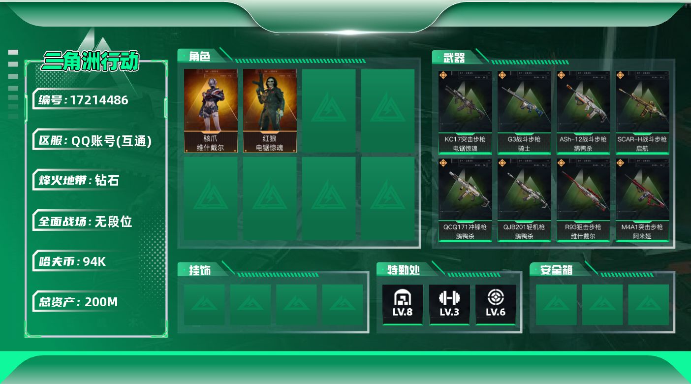 [17214486]【店主推荐捡漏号!可直接换绑】200m总资产-94k哈伏币-60烽火等级-钻石-1战场等级-无军衔 【干员外观】:骇爪-维什戴尔,红狼-电锯惊魂 【近战皮肤】:近战-黑鹰 【传说外观】:M4A1突击步枪-阿米娅,ASh-12战斗步枪-鹅鸭杀,SCAR-H战斗步枪-启航,G3战斗步枪-骑士,CAR-15突击步枪-阿米娅,KC17突击步枪-电锯惊魂,QCQ171冲锋枪-鹅鸭杀,QJB201轻机枪-鹅鸭杀,R93狙击步枪-维什戴尔 【史诗外观】:腾龙突击步枪-猎鳄行动,MP5冲锋枪-战术竞备,MP5冲锋枪-竞技风,Vector冲锋枪-猎鳄行动,勇士冲锋枪-深海恐惧,勇士冲锋枪-工业狂潮 【稀有外观】:AKM突击步枪-肃杀,QBZ95-1突击步枪-公平竞技,M7战斗步枪-捣蛋鬼,SCAR-H战斗步枪-荣耀列队,腾龙突击步枪-前沿科技,腾龙突击步枪-冰天雪地,MP5冲锋枪-弄臣,MP5冲锋枪-哈夫克卫队,P90冲锋枪-黄昏,P90冲锋枪-捣蛋鬼,UZI冲锋枪-前沿科技,UZI冲锋枪-亚特兰蒂斯,SMG-45-行动开启,SMG-45冲锋枪-幻影结构,勇士冲锋枪-前沿科技,M1014霰弹枪-幻影结构,QJB201轻机枪-哈夫克卫队,SKS射手步枪-弄臣,G18-星链科技,G18-哈夫克航天 【普通外观】:PKM通用机枪-旧工业,M4A1突击步枪-高雅黑,QBZ95-1突击步枪-海浪,QBZ95-1突击步枪-海色,QBZ191突击步枪-三角洲力量,K416突击步枪-几何迷彩,K416突击步枪-高雅黑,M16A4突击步枪-高雅黑,M7战斗步枪-红色涂装,SG552突击步枪-浅蓝涂装,SG552突击步枪-海浪,SCAR-H战斗步枪-数码迷彩,G3战斗步枪-高雅黑,PTR-32突击步枪-黄蜂,MP5冲锋枪-黄蜂,Vector冲锋枪-几何迷彩,UZI冲锋枪-海色,野牛冲锋枪-高雅黑,M1014霰弹枪-高雅黑,M1014霰弹枪-海浪,M249轻机枪-黄蜂,M250通用机枪-条纹,SVD狙击步枪-高雅黑,SR-25射手步枪-黄蜂,SV-98狙击步枪-红色涂装,QSZ92G-条纹,沙漠之鹰-海浪,沙漠之鹰-高雅黑 【载具外观】:轮式突击炮-荣耀 【军牌】:军牌-享受音乐,军牌-零号大坝,军牌-修整,军牌-信誉优秀,军牌-小心鳄鱼 【挂饰】:挂饰-维什戴尔,挂饰-诡影狙击兵*2,挂饰-诡影喷火兵