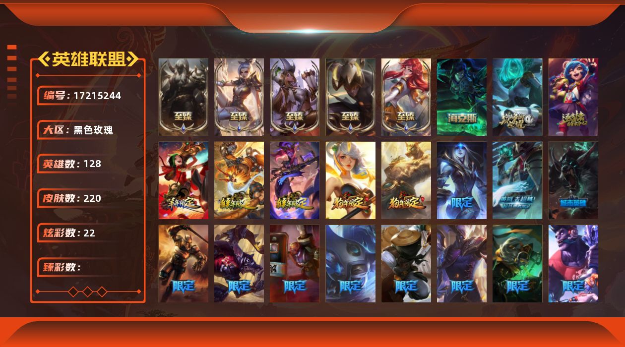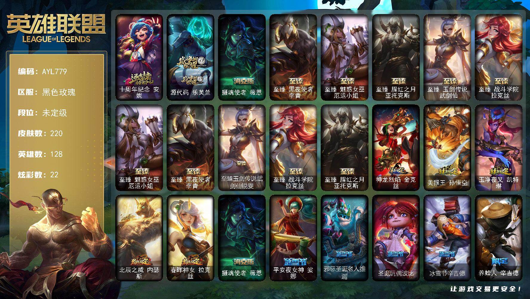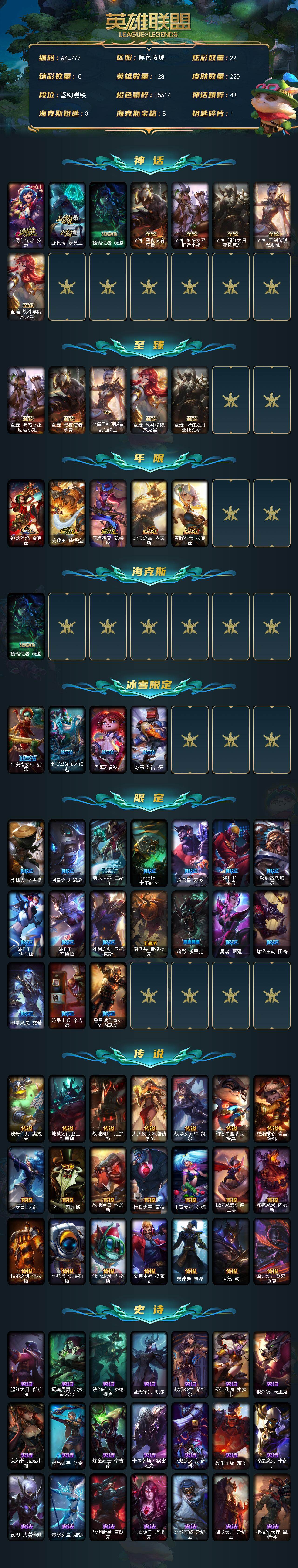 [17215244]未定级段位-128英雄-220皮肤-22炫彩-0终极-8神话-26限定-21传说-59史诗 【神话皮肤】:十周年纪念安妮,源代码乐芙兰,摄魂使者薇恩,至臻黑夜使者李青,至臻魅惑女巫厄运小姐,至臻腥红之月亚托克斯,至臻玉剑传说武剑仙,至臻战斗学院拉克丝 【至臻皮肤】:至臻魅惑女巫厄运小姐,至臻黑夜使者李青,至臻玉剑传说武剑仙锐雯,至臻战斗学院拉克丝,至臻腥红之月亚托克斯 【年限皮肤】:神龙烈焰金克丝,美猴王孙悟空,玉净夜叉凯特琳,北辰之威内瑟斯,春晖神女拉克丝 【海克斯皮肤】:摄魂使者薇恩 【冰雪限定】:平安夜女神娑娜,邪恶圣诞老人维迦,圣诞玩偶波比,冰雪节辛吉德 【限定皮肤】:养蜂人辛吉德,创星之灵璐璐,地底世界崔斯特,Fnatic卡尔萨斯,暗杀星蒙多,SKTT1李青,SSW雷恩加尔,SKTT1伊莉丝,SKTT1辛德拉,胜利之剑亚托克斯,南瓜头费德提克,暗影沃里克,勇者阿狸,都铎王朝图奇,御星魔矢艾希,防暴士兵辛吉德,警用试作体K9内瑟斯 【传说皮肤】:铁哥们儿奥拉夫,地狱之门卫士加里奥,战地机甲厄加特,大天使长米迦勒凯尔,战场女武神凯尔,约德尔国队长提莫,烈焰雄心崔丝塔娜,女皇艾希,绅士科加斯,战地巨兽科加斯,律政大亨蒙多,电玩女神娑娜,银河魔装机神兰博,炼狱魔犬内瑟斯,枯萎之壤泽拉斯,宇航员诺提勒斯,泳池派对吉格斯,金牌主播德莱文,奥德赛凯隐,天煞劫,源计划毁灭派克 【史诗皮肤】:腥红之月崔斯特,摄魂男爵弗拉基米尔,铁钩船长费德提克,圣光审判凯尔,战场公主希维尔,圣洁化身索拉卡,狼外婆沃里克,女船长厄运小姐,紫晶射手艾希,炼金狂士辛吉德,卡尔萨斯祸害之光,飞越疯人院萨科,战争血统蒙多,掠星魔刃卡萨丁,夜刃艾瑞莉娅,寒冰女皇迦娜,恐惧新星普朗克,血石诅咒塔里克,北领前线斯维因,驯龙大师斯维因,抵抗军天使凯特琳,霸天巨兽墨菲特,前线指挥官卡特琳娜,沙漠风暴卡特琳娜,枯萎之壤雷克顿,龙骑统帅嘉文四世,死亡绽放伊莉丝,腥红之月伊莉丝,灵魂烈焰布兰德,艳后奈德丽,四神之力乌迪尔,军神战甲波比,血色之锤波比,飞车暴走族古拉加斯,大夏武士潘森,刺客信条凯南,腥红之月凯南,孤高游侠盖伦,深海怪鱼克格莫,腥红之月鬼武者慎,战国大名慎,银河魔装机神希瓦娜,铁血猎人雷恩加尔,驯龙女巫璐璐,生化骑士德莱厄斯,天启骑士杰斯,源代码丽桑卓,血羽凤凰奎因,仲裁圣女辛德拉,亚特兰蒂斯辛德拉,