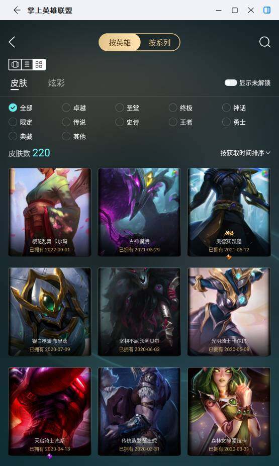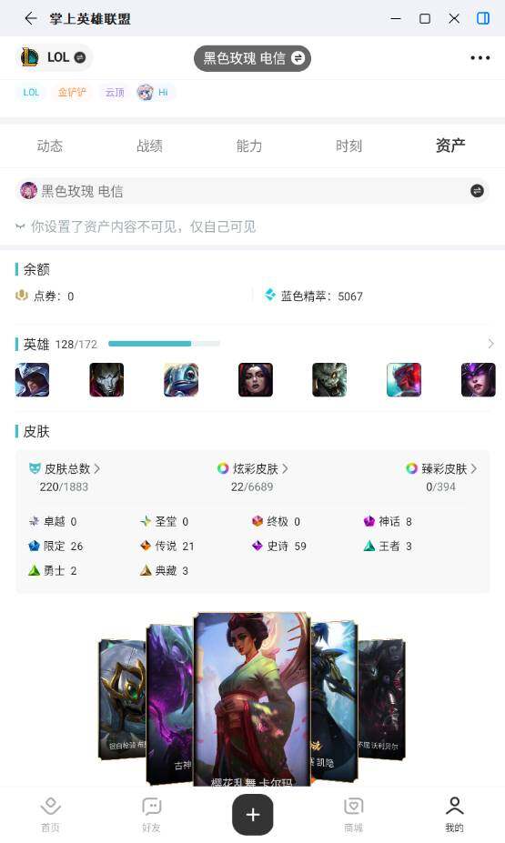 [17215244]未定级段位-128英雄-220皮肤-22炫彩-0终极-8神话-26限定-21传说-59史诗