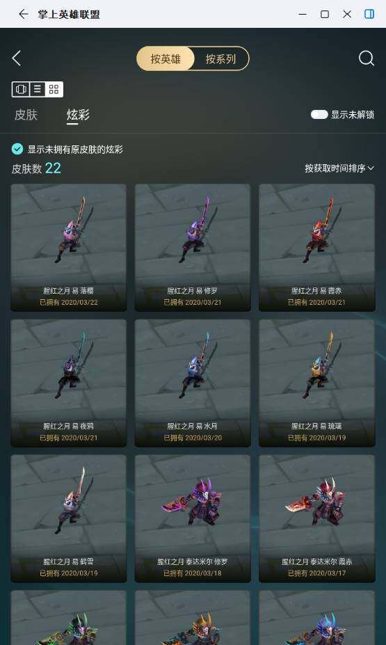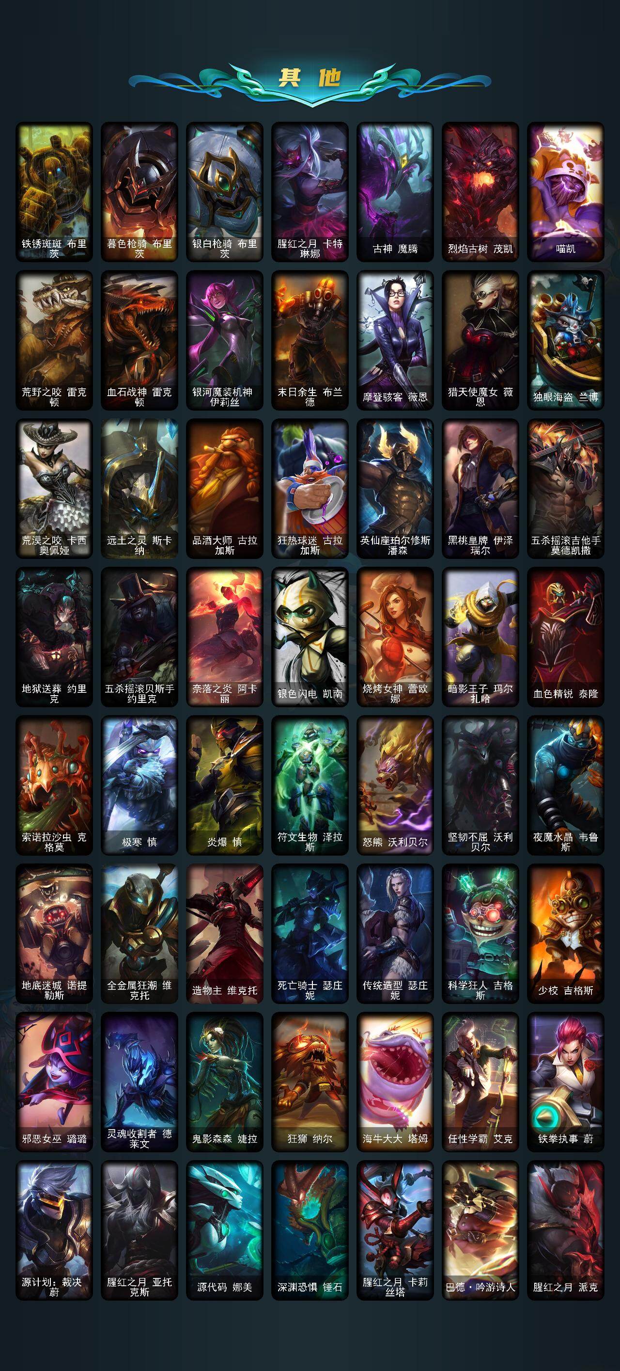 【史诗皮肤】:腥红之月崔斯特,摄魂男爵弗拉基米尔,铁钩船长费德提克,圣光审判凯尔,战场公主希维尔,圣洁化身索拉卡,狼外婆沃里克,女船长厄运小姐,紫晶射手艾希,炼金狂士辛吉德,卡尔萨斯祸害之光,飞越疯人院萨科,战争血统蒙多,掠星魔刃卡萨丁,夜刃艾瑞莉娅,寒冰女皇迦娜,恐惧新星普朗克,血石诅咒塔里克,北领前线斯维因,驯龙大师斯维因,抵抗军天使凯特琳,霸天巨兽墨菲特,前线指挥官卡特琳娜,沙漠风暴卡特琳娜,枯萎之壤雷克顿,龙骑统帅嘉文四世,死亡绽放伊莉丝,腥红之月伊莉丝,灵魂烈焰布兰德,艳后奈德丽,四神之力乌迪尔,军神战甲波比,血色之锤波比,飞车暴走族古拉加斯,大夏武士潘森,刺客信条凯南,腥红之月凯南,孤高游侠盖伦,深海怪鱼克格莫,腥红之月鬼武者慎,战国大名慎,银河魔装机神希瓦娜,铁血猎人雷恩加尔,驯龙女巫璐璐,生化骑士德莱厄斯,天启骑士杰斯,源代码丽桑卓,血羽凤凰奎因,仲裁圣女辛德拉,亚特兰蒂斯辛德拉,