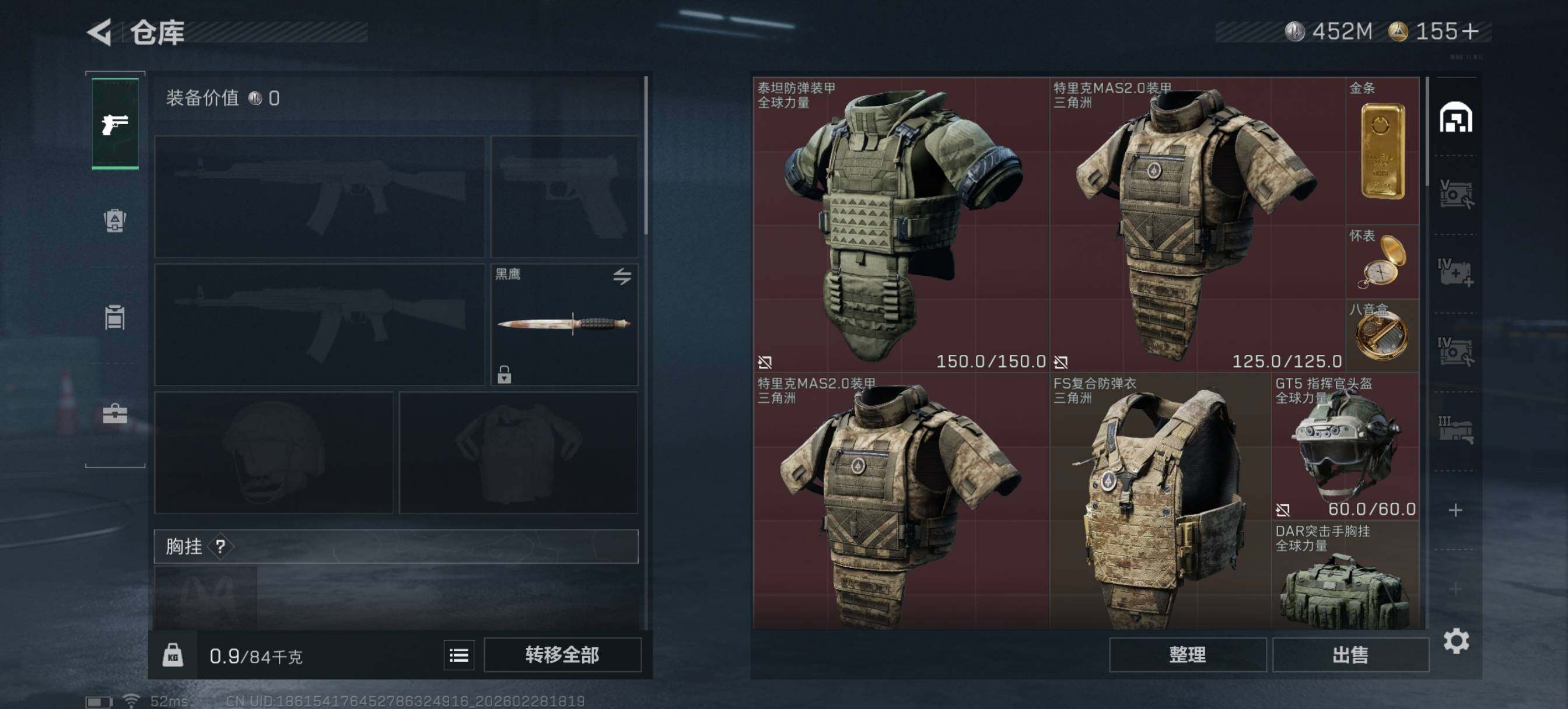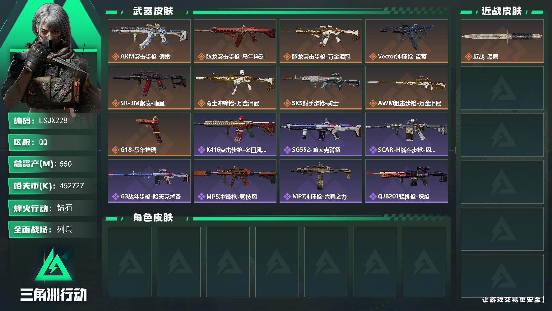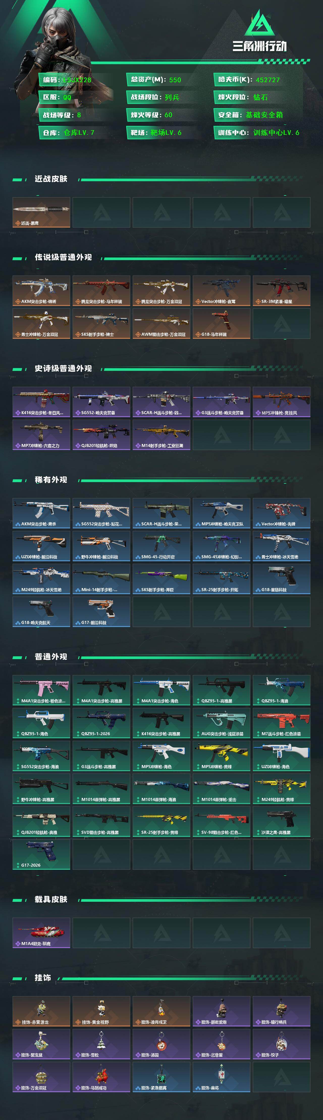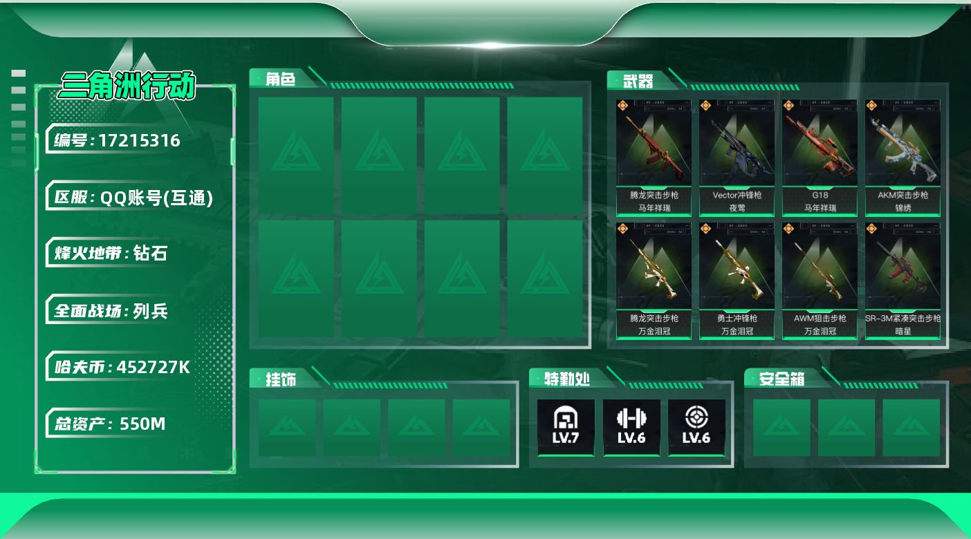 [17215316]【特价出售/店主推荐】550m总资产-452727k哈伏币-60烽火等级-钻石-8战场等级-列兵 【近战皮肤】:近战-黑鹰 【传说外观】:AKM突击步枪-锦绣,腾龙突击步枪-马年祥瑞,腾龙突击步枪-万金泪冠,Vector冲锋枪-夜莺,SR-3M紧凑突击步枪-暗星,勇士冲锋枪-万金泪冠,SKS射手步枪-骑士,AWM狙击步枪-万金泪冠,G18-马年祥瑞 【史诗外观】:K416突击步枪-冬日风情,SG552突击步枪-哈夫克警备,SCAR-H战斗步枪-囚徒,G3战斗步枪-哈夫克警备,MP5冲锋枪-竞技风,MP7冲锋枪-六套之力,QJB201轻机枪-炽焰,M14射手步枪-工业狂潮 【稀有外观】:AKM突击步枪-肃杀,SG552突击步枪-贴花艺术,SCAR-H战斗步枪-荣耀列队,MP5冲锋枪-哈夫克卫队,Vector冲锋枪-先锋,UZI冲锋枪-前沿科技,野牛冲锋枪-前沿科技,SMG-45冲锋枪-行动开启,SMG-45冲锋枪-幻影结构,勇士冲锋枪-冰天雪地,M249轻机枪-冰天雪地,Mini-14射手步枪-荣耀列队,SKS射手步枪-弄臣,SR-25射手步枪-开拓,G18-星链科技,G18-哈夫克航天,G17-前沿科技 【普通外观】:M4A1突击步枪-粉色涂装,M4A1突击步枪-高雅黑,M4A1突击步枪-海色,QBZ95-1突击步枪-高雅黑,QBZ95-1突击步枪-海浪,QBZ95-1突击步枪-海色,QBZ95-1突击步枪-2026,K416突击步枪-高雅黑,AUG突击步枪-浅蓝涂装,M7战斗步枪-红色涂装,SG552突击步枪-海浪,G3战斗步枪-高雅黑,MP5冲锋枪-海色,MP5冲锋枪-黄蜂,UZI冲锋枪-海色,野牛冲锋枪-高雅黑,M1014霰弹枪-高雅黑,M1014霰弹枪-海浪,M1014霰弹枪-重击,M249轻机枪-黄蜂,QJB201轻机枪-典雅,SVD狙击步枪-高雅黑,SR-25射手步枪-黄蜂,SV-98狙击步枪-红色涂装,沙漠之鹰-高雅黑,G17-2026 【载具外观】:M1A4坦克-驯鹿 【挂饰】:挂饰-赤霄游龙,挂饰-黄金视野,挂饰-凌霄戍卫,挂饰-崩岩重炮,挂饰-暗行哨兵*2,挂饰-聚宝盆,挂饰-雪松,挂饰-汤圆,挂饰-北非蛋,挂饰-饺子,挂饰-万金泪冠,挂饰-马到成功,挂饰-紧急撤离*13,挂饰-麻将*3