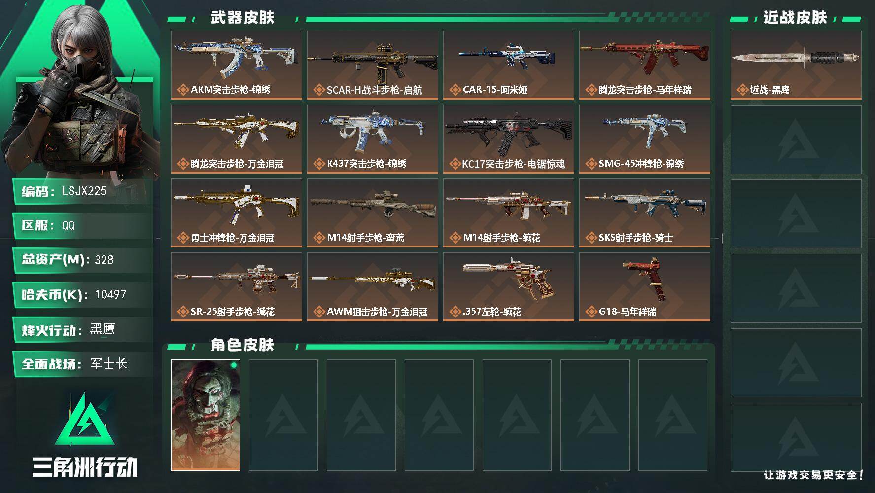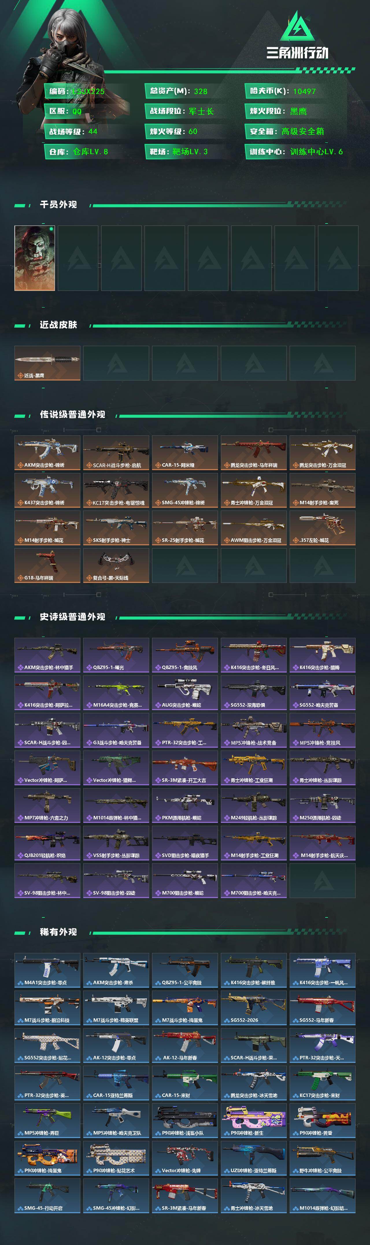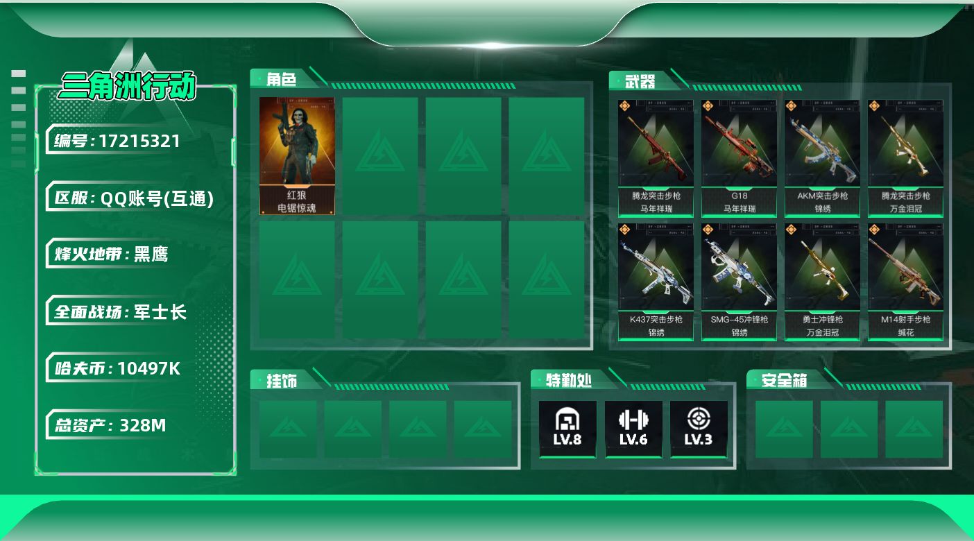 [17215321]【特价出售/店主推荐】328m总资产-10497k哈伏币-60烽火等级-黑鹰-44战场等级-军士长 【干员外观】:红狼-电锯惊魂 【近战皮肤】:近战-黑鹰 【传说外观】:AKM突击步枪-锦绣,SCAR-H战斗步枪-启航,CAR-15突击步枪-阿米娅,腾龙突击步枪-马年祥瑞,腾龙突击步枪-万金泪冠,K437突击步枪-锦绣,KC17突击步枪-电锯惊魂,SMG-45冲锋枪-锦绣,勇士冲锋枪-万金泪冠,M14射手步枪-蛮荒,M14射手步枪-缄花,SKS射手步枪-骑士,SR-25射手步枪-缄花,AWM狙击步枪-万金泪冠,.357左轮-缄花,G18-马年祥瑞,复合弓-黑·天际线 【史诗外观】:AKM突击步枪-林中猎手,QBZ95-1突击步枪-曙光,QBZ95-1突击步枪-竞技风,K416突击步枪-冬日风情,K416突击步枪-腊梅,K416突击步枪-阿萨拉特攻,M16A4突击步枪-竞赛选手,AUG突击步枪-蝮蛇,SG552突击步枪-深海恐惧,SG552突击步枪-哈夫克警备,SCAR-H战斗步枪-囚徒,G3战斗步枪-哈夫克警备,PTR-32突击步枪-工业狂潮,MP5冲锋枪-战术竞备,MP5冲锋枪-竞技风,Vector冲锋枪-阿萨拉文明,Vector冲锋枪-猎鳄行动,SR-3M紧凑突击步枪-开工大吉,勇士冲锋枪-工业狂潮,勇士冲锋枪-丛影谍踪,MP7冲锋枪-六套之力,M1014霰弹枪-林中猎手,PKM通用机枪-蝮蛇,M249轻机枪-丛影谍踪,M250通用机枪-囚徒,QJB201轻机枪-炽焰,VSS射手步枪-丛影谍踪,SVD狙击步枪-暗夜猎手,M14射手步枪-工业狂潮, M14射手步枪-航天庆典,SV-98狙击步枪-林中猎手,SV-98狙击步枪-囚徒,M700狙击步枪-蝮蛇,M700狙击步枪-哈夫克警备 【稀有外观】:M4A1突击步枪-零点,AKM突击步枪-肃杀,QBZ95-1突击步枪-公平竞技,K416突击步枪-碳纤维,K416突击步枪-一帆风顺,M7战斗步枪-前沿科技,M7战斗步枪-精英联盟,M7战斗步枪-捣蛋鬼,SG552突击步枪-2026,SG552突击步枪-马年新春,SG552突击步枪-贴花艺术,AK-12突击步枪-零点, AK-12突击步枪-马年新春,SCAR-H战斗步枪-荣耀列队,PTR-32突击步枪-天网,PTR-32突击步枪-英雄,CAR-15突击步枪-亚特兰蒂斯,