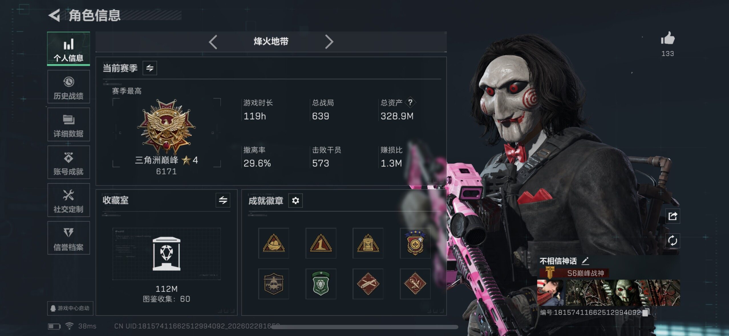 [17215321]【特价出售/店主推荐】328m总资产-10497k哈伏币-60烽火等级-黑鹰-44战场等级-军士长