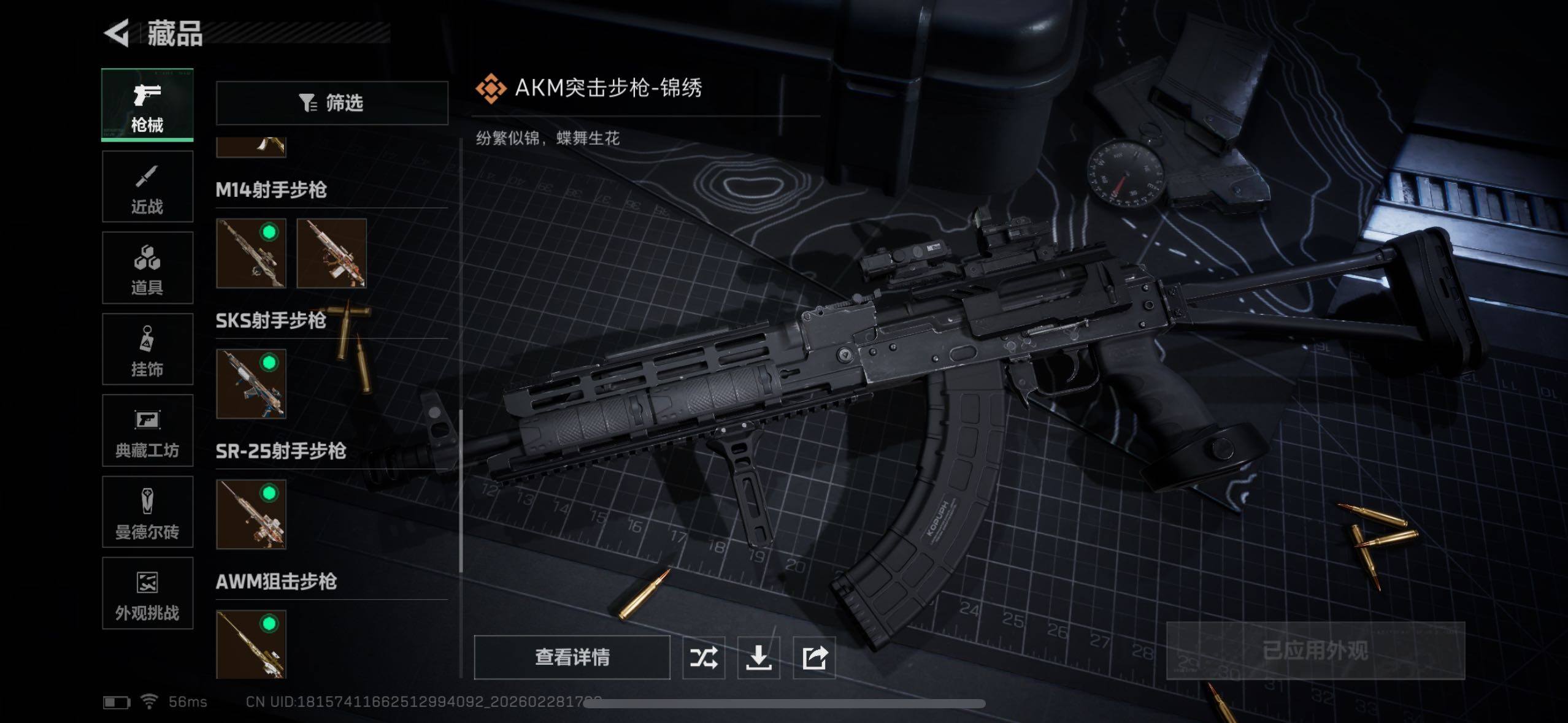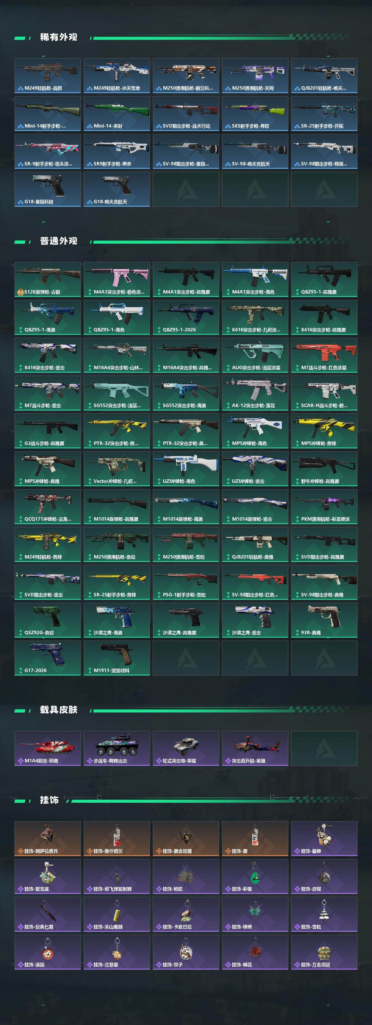 【稀有外观】:M4A1突击步枪-零点,AKM突击步枪-肃杀,QBZ95-1突击步枪-公平竞技,K416突击步枪-碳纤维,K416突击步枪-一帆风顺,M7战斗步枪-前沿科技,M7战斗步枪-精英联盟,M7战斗步枪-捣蛋鬼,SG552突击步枪-2026,SG552突击步枪-马年新春,SG552突击步枪-贴花艺术,AK-12突击步枪-零点, AK-12突击步枪-马年新春,SCAR-H战斗步枪-荣耀列队,PTR-32突击步枪-天网,PTR-32突击步枪-英雄,CAR-15突击步枪-亚特兰蒂斯,