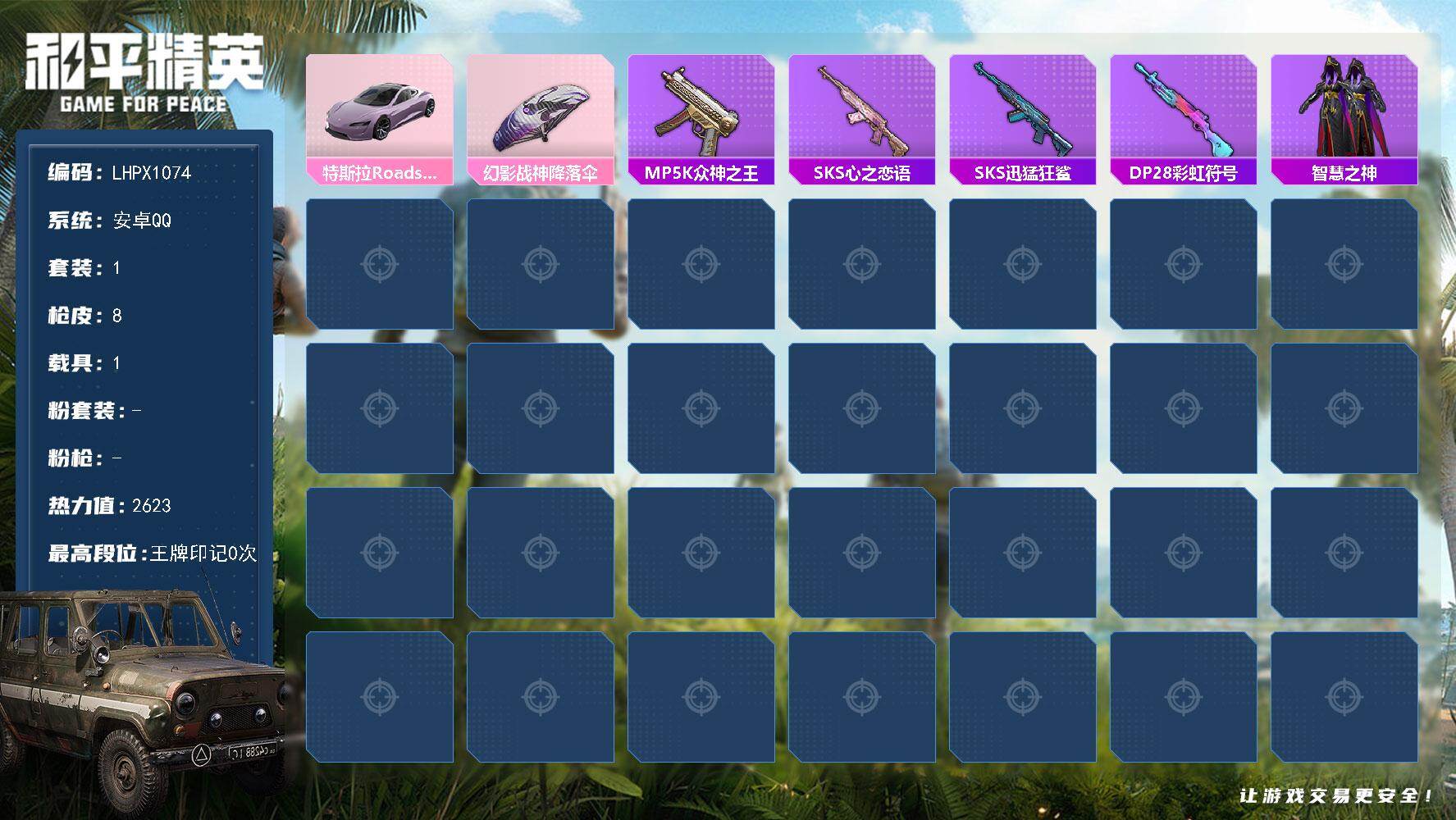 - [15204291]【店主推荐捡漏号!可直接换绑】 苹果 手Q-12粉装-7特效枪-3载具-6粉色飞行器-10.1w热力值-17王牌印记-218套装-313枪皮【热门品类】:角色-军刀雅典娜,套装-龟仙人,套装-粉红小猪,角色-8号机,角色-Mark.06【粉色载具】:玛莎拉蒂Quattroporte(夜幕蓝),保时捷918 Spyder(沉静蓝),保时捷Cayenne(橄榄绿)【粉色套装】:粉装-新星烈龙,粉装-彩虹甜喵,粉装-暗夜鎏金,粉装-飒粉甜心,粉装-莲影清波,粉装-镜光幻境,角色-小蓝,角色-美琪,套装-创世·救赎,粉装-幻影飞狐,角色-冷漠罗丽,角色-罗征【粉色枪皮等级】:SCAR-L-锦绣绵绵(五级),M416-风花雪月(七级),M416-电玩时刻(五级),AUG-圣斗士星矢(七级),Kar98K-巳巳如意(五级),Kar98K-圣域龙灵(三级),DP-28-豹影疾电(五级)【粉色飞行器】:太空嘟嘟飞行器,镜域双华-灵镜之阶,龙翔九天飞行器,深渊漩涡飞行器,雀灵庇佑飞行器