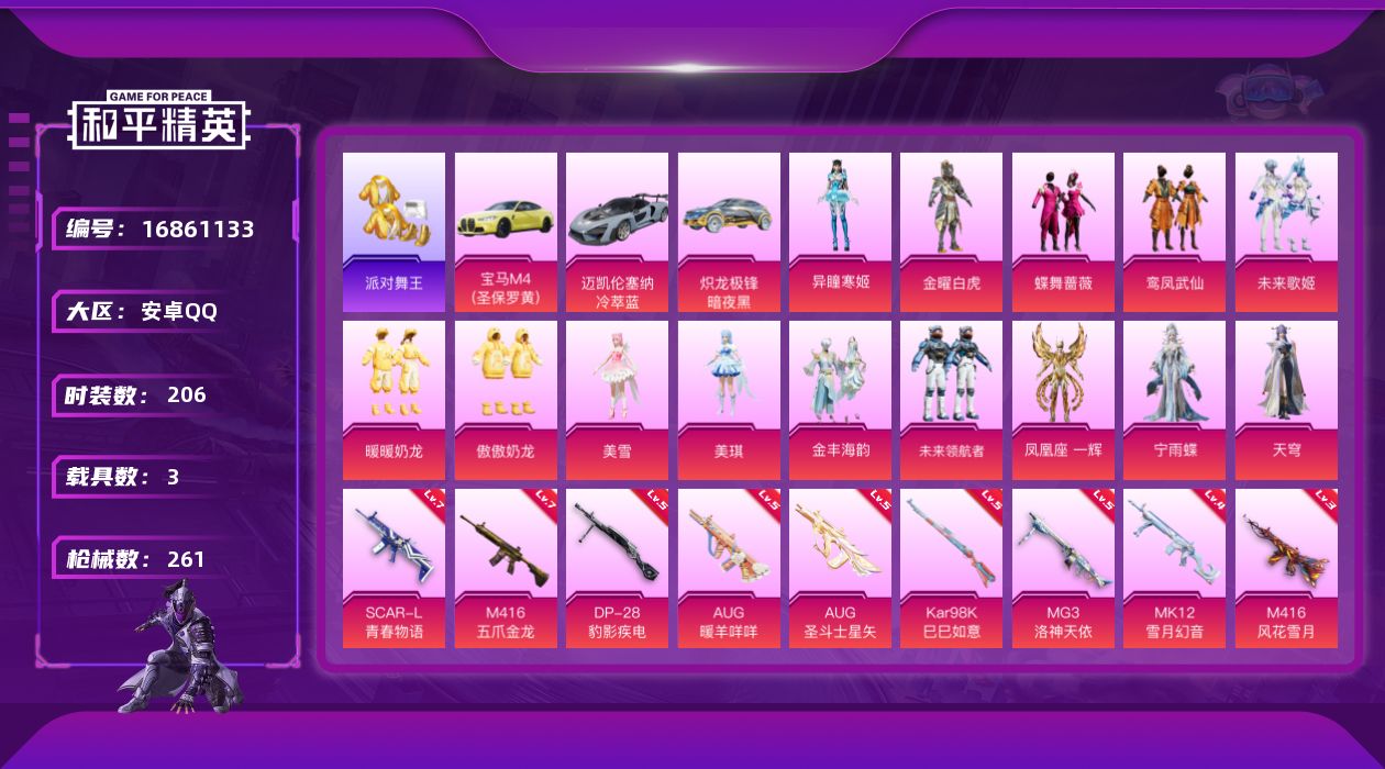 [16861133]【特价出售/店主推荐】安卓 手Q-14粉装-10特效枪-3载具-2粉色飞行器-85263热力值-21王牌印记-206套装-261枪皮 【热门品类】:绝对防御上衣,套装-派对舞王,套装-金羽特工,套装-龟仙人,套装-粉红小猪,角色-Mark.06 【粉色套装】:粉装-金曜白虎,粉装-蝶舞蔷薇,粉装-鸾凤武仙,粉装-未来歌姬,粉装-暖暖奶龙,粉装-傲傲奶龙,角色-美雪,角色-美琪,粉装-金丰海韵,粉装-未来领航者,角色-凤凰座 一辉,角色-宁雨蝶,角色-天穹,角色-异瞳寒姬 【粉色枪皮等级】:SCAR-L-青春物语(七级),M416-五爪金龙(七级),M416-风花雪月(三级),AUG-暖羊咩咩(五级),AUG-圣斗士星矢(五级),Kar98K-巳巳如意(五级),莫辛纳甘-未来领航者(二级),MK12-雪月幻音(四级),DP-28-豹影疾电(五级),MG3-洛神天依(五级) 【粉色载具】:宝马M4(圣保罗黄),迈凯伦塞纳(冷萃蓝),炽龙极锋(暗夜黑) 【粉色枪皮】:SCAR-L-青春物语,M416-五爪金龙,M416-风花雪月,AUG-暖羊咩咩,AUG-圣斗士星矢,Kar98K-巳巳如意,莫辛纳甘-未来领航者,MK12-雪月幻音,DP-28-豹影疾电,MG3-洛神天依 【粉色飞行器】:幻海精灵飞行器,宁雨蝶飞行器 【粉色降落伞】:古战神甲降落伞,暗夜玫瑰降落伞,暗夜鎏金降落伞,黄族统领降落伞,白勺歌姬降落伞,镜域双华降落伞,创世·救赎降落伞,临安公主降落伞,赛博古神降落伞,雪月幻音降落伞,圣域龙灵降落伞,宁雨蝶降落伞,炫彩糖果降落伞 【稀有套装】:套装-龟仙人,套装-巳巳如意,套装-雏菊兔兔,套装-萝兰蝴蝶,套装-小熊娃娃,套装-糖糖葫芦,套装-青团波波,角色-许七安,套装-燕燕于飞,套装-鱼渊荷华,套装-粉恋花,套装-紫幽梦,套装-蓝冰羽,套装-云朵鹅,套装-雪绒豹,角色-时希公主,角色-灵公主 【稀有枪皮】:AKM-彩虹符号,AKM-恐龙拽拽,AKM-灼热熔岩,AKM-生命誓言,AKM-破晓战魂,AKM-萌趣颜团子,AKM-虎虎生威,AKM-霓虹街区,AKM-龙的传人,M16A4-幻世战舞者,M16A4-蓝色火焰,SCAR-L-夜灯,SCAR-L-玉兔迎春,SCAR-L-红色方程式,SCAR-L-黄金龙骨,SCAR-L-冷漠罗丽,M416-夜灯,M416-糯团青竹