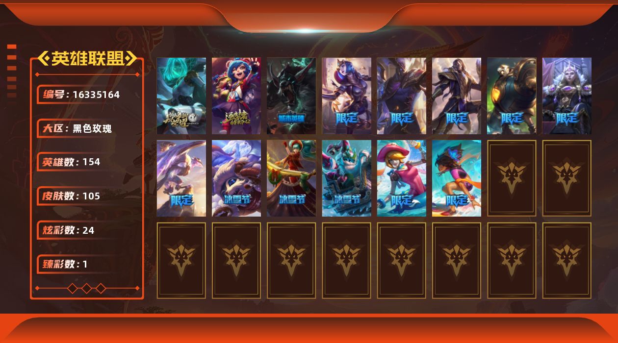 [16335164]【特价出售/店主推荐】未定级段位-154英雄-105皮肤-24炫彩-0终极-2神话-15限定-8传说-28史诗