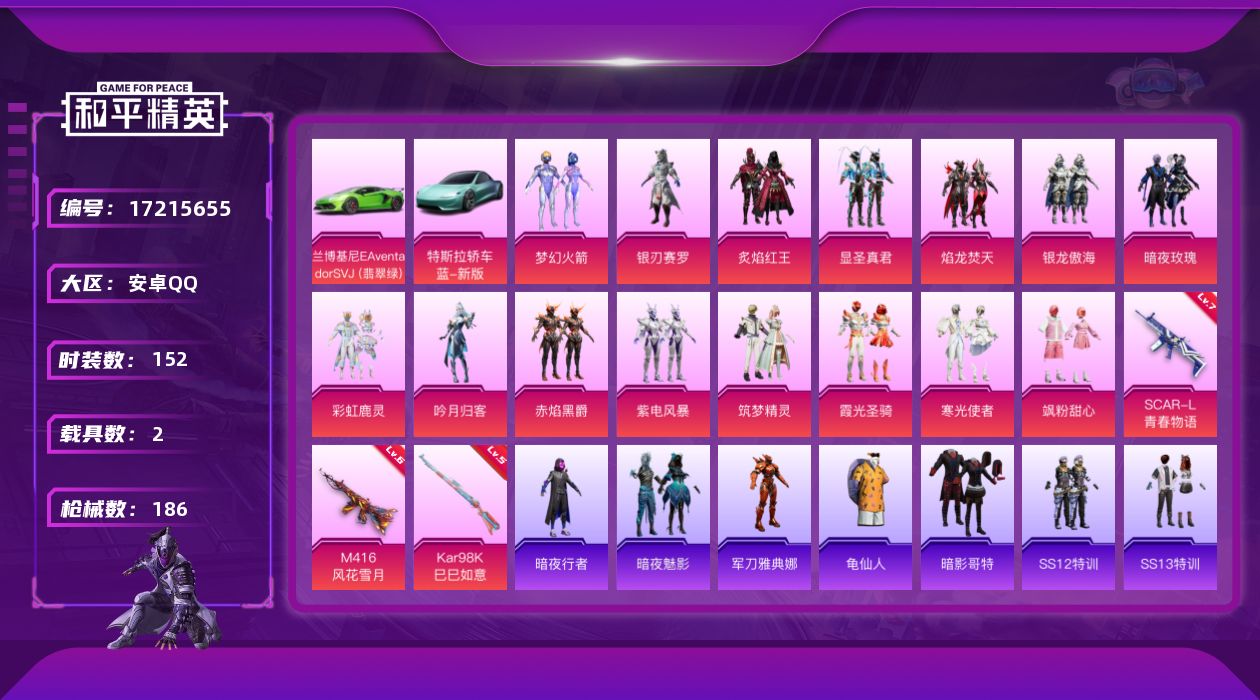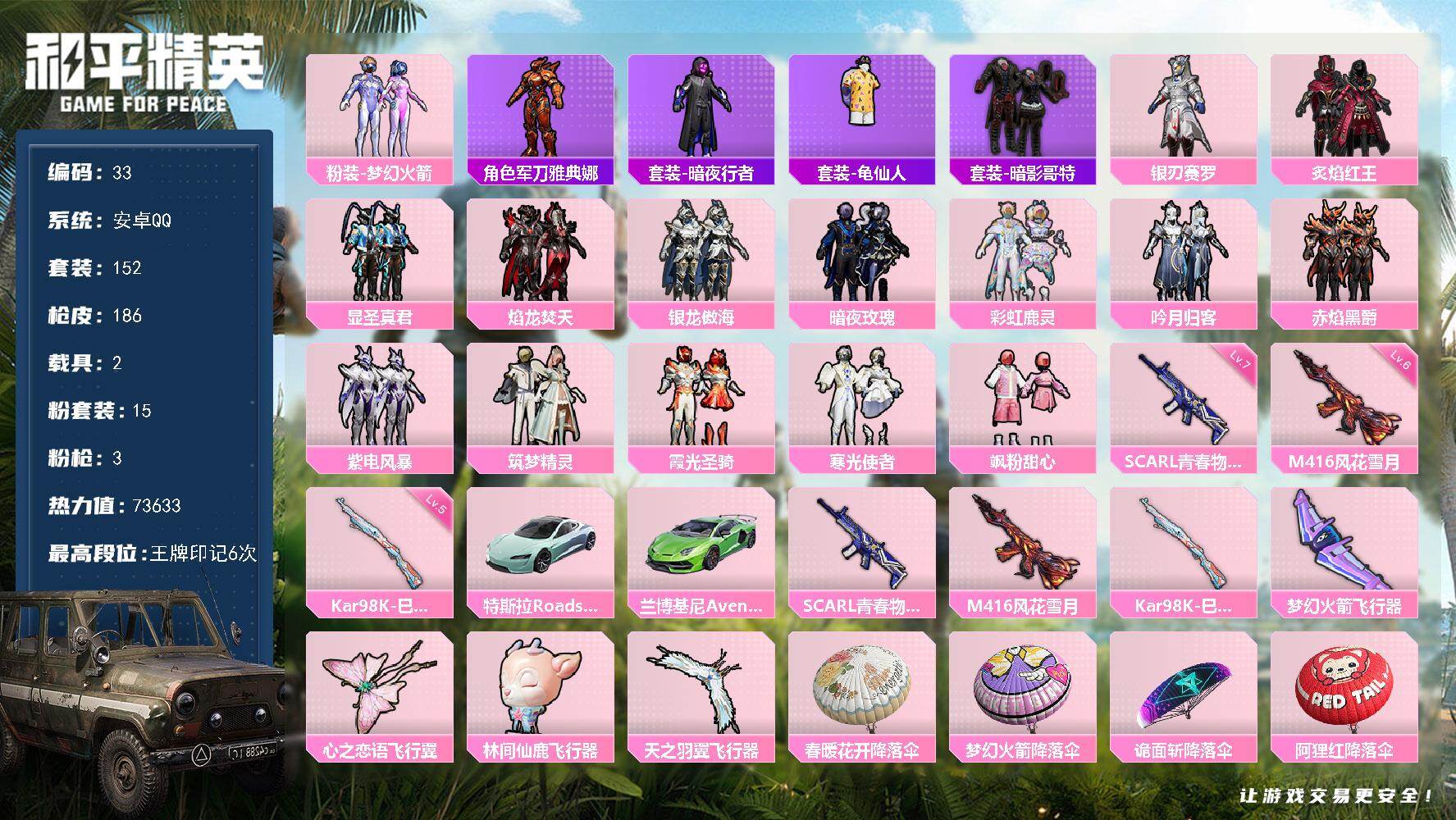 [17215655]安卓 手Q-15粉装-3特效枪-2载具-4粉色飞行器-73633热力值-6王牌印记-152套装-186枪皮