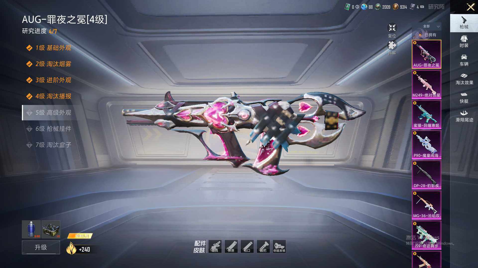 【粉色枪皮】:AUG-罪夜之冕,蜜獾-异瞳寒姬,AKS-74U-星穹咏叹调,JS9-奇迹舞步,P90-魔童闹海 敖丙,Kar98K-巳巳如意,AMR-智耀战神,M249-绝对恒星,DP-28-千金淑猫,DP-28-豹影疾电,MG-36-沧焰双生