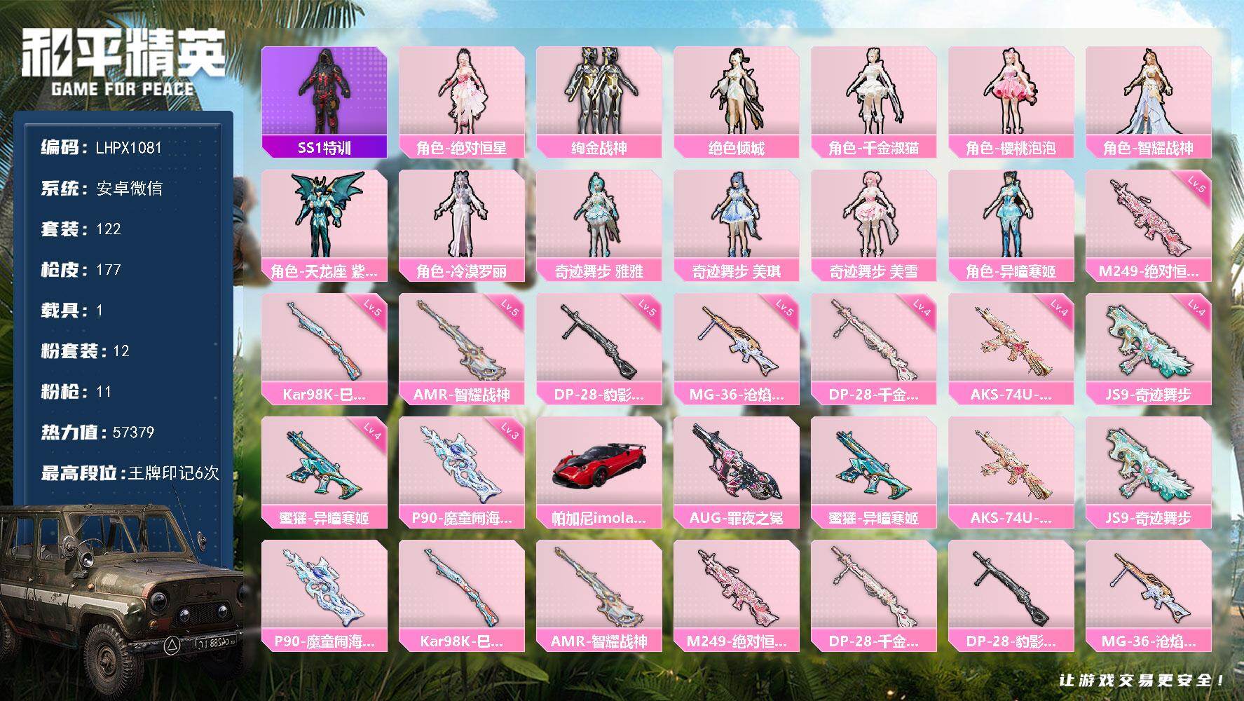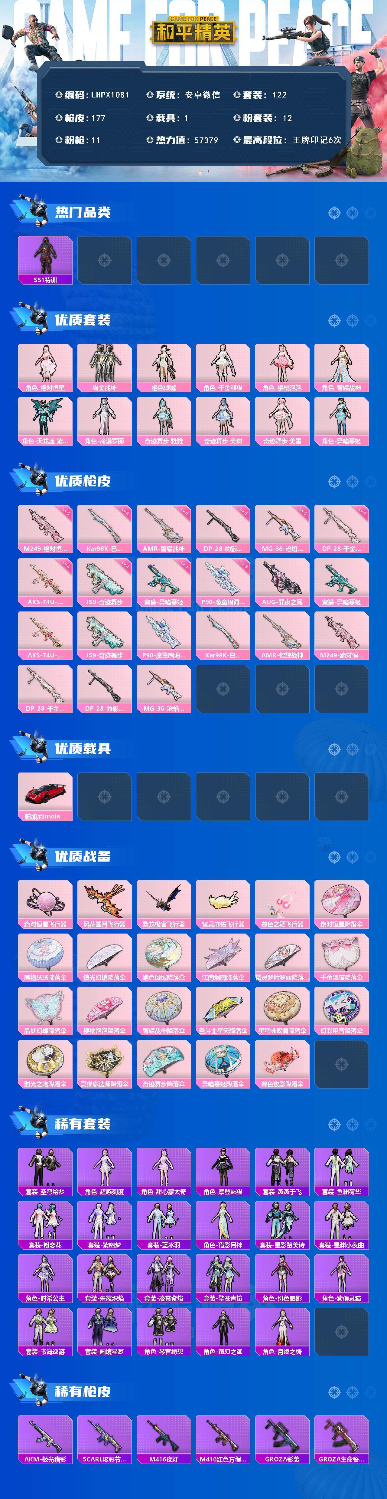 [16767646]【特价出售/店主推荐】安卓 微信-12粉装-11特效枪-1载具-6粉色飞行器-57379热力值-6王牌印记-122套装-177枪皮 【热门品类】:套装-SS1特训 【粉色套装】:角色-绝对恒星,粉装-绚金战神,角色-绝色倾城,角色-千金淑猫,角色-樱桃泡泡,角色-智耀战神,角色-天龙座 紫龙,角色-冷漠罗丽,角色-奇迹舞步 雅雅,角色-奇迹舞步 美琪,角色-奇迹舞步 美雪,角色-异瞳寒姬 【粉色枪皮等级】:蜜獾-异瞳寒姬(四级),AKS-74U-星穹咏叹调(四级),JS9-奇迹舞步(四级),P90-魔童闹海 敖丙(三级),Kar98K-巳巳如意(五级),AMR-智耀战神(五级),M249-绝对恒星(五级),DP-28-千金淑猫(四级),DP-28-豹影疾电(五级),MG-36-沧焰双生(五级) 【粉色载具】:帕加尼imola(光影红) 【粉色枪皮】:AUG-罪夜之冕,蜜獾-异瞳寒姬,AKS-74U-星穹咏叹调,JS9-奇迹舞步,P90-魔童闹海 敖丙,Kar98K-巳巳如意,AMR-智耀战神,M249-绝对恒星,DP-28-千金淑猫,DP-28-豹影疾电,MG-36-沧焰双生 【粉色飞行器】:绝对恒星飞行器,炫彩糖果飞行器,风花雪月飞行器,繁龙极客飞行器,雀灵庇佑飞行器,暮色之舞飞行器 【粉色降落伞】:绝对恒星降落伞,萌物绒绒降落伞,镜光幻境降落伞,绝色倾城降落伞,江南烟雨降落伞,精灵梦叶罗丽降落伞,千金淑猫降落伞,晶梦幻蝶降落伞,樱桃泡泡降落伞,智耀战神降落伞,圣斗士星矢降落伞,星穹咏叹调降落伞,幻彩电音降落伞,时光之吻降落伞,灵猫魔法师降落伞,奇迹舞步降落伞,异瞳寒姬降落伞,炫彩糖果降落伞,暮色玫影降落伞 【稀有套装】:套装-圣穹绘梦,角色-超感刻度,角色-甜心蒙太奇,套装-雪国风尚,套装-炫彩糖果,角色-摩登魅猫,套装-燕燕于飞,套装-鱼渊荷华,套装-粉恋花,套装-紫幽梦,套装-蓝冰羽,角色-猎影月神,套装-星影赞美诗,套装-星渊小夜曲,角色-时希公主,套装-朱霞炽焰,套装-凌霄紫焰,套装-擎苍青焰,角色-绯色魅影,角色-紫俏灵猫,套装-书海巡游,套装-画境星梦,套装-琴音绮想,角色-霜刃之御,角色-月烬之祷 【稀有枪皮】:S12K-镜光械姬,MK12-镜光械姬,AUG-冰晶雪宝,SCAR-L-镜光械姬,AKM-极光猎影,SCAR-L-炫彩节奏,M416-夜