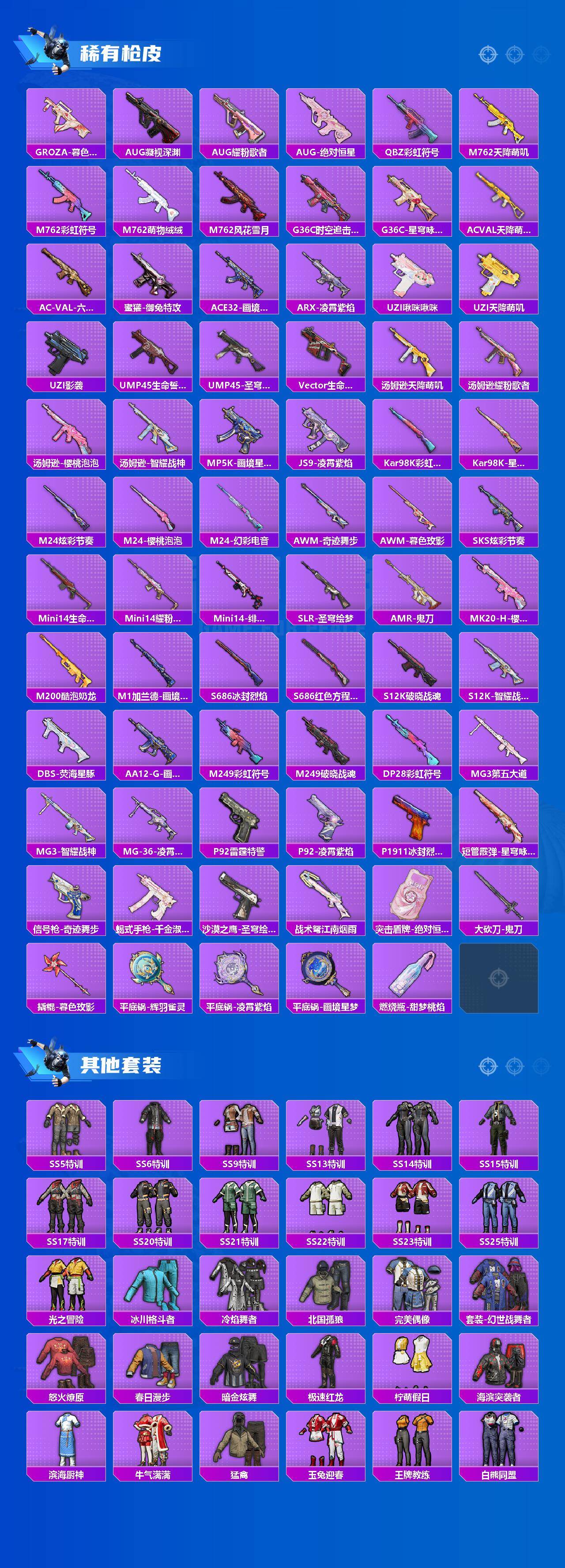 【稀有枪皮】:S12K-镜光械姬,MK12-镜光械姬,AUG-冰晶雪宝,SCAR-L-镜光械姬,AKM-极光猎影,SCAR-L-炫彩节奏,M416-夜