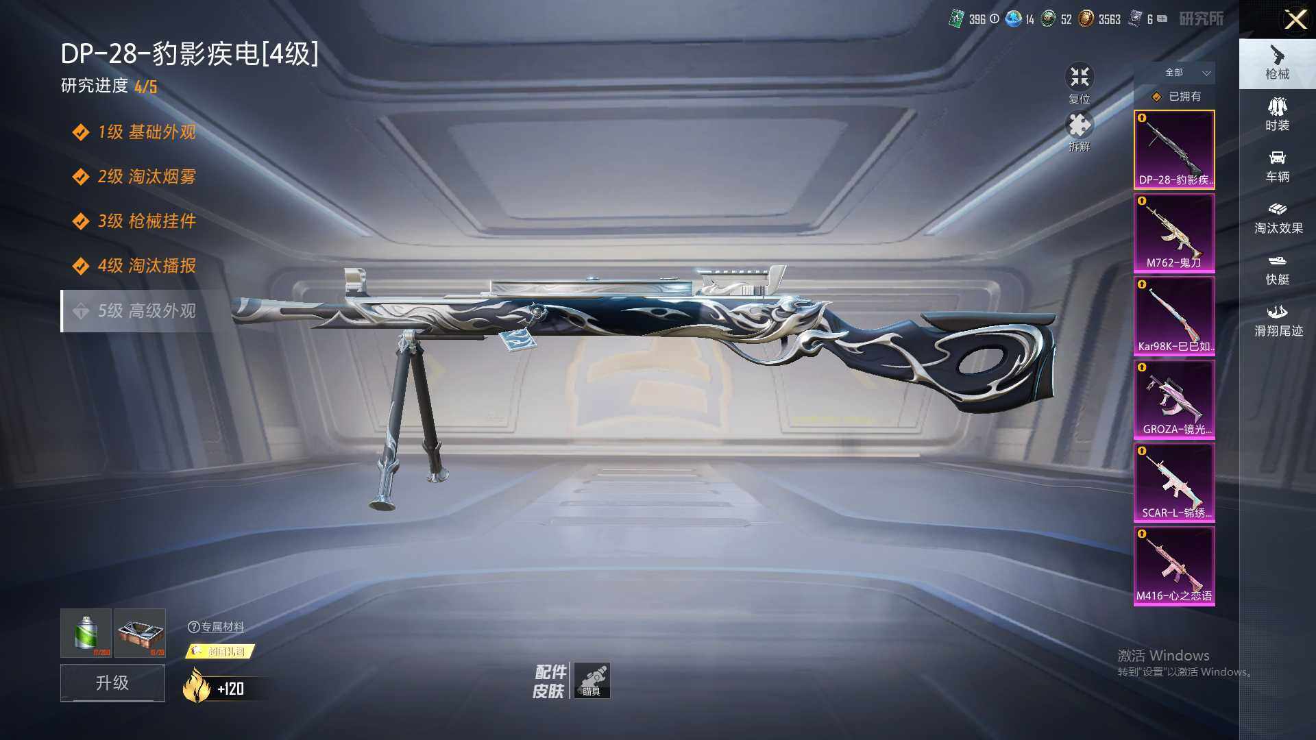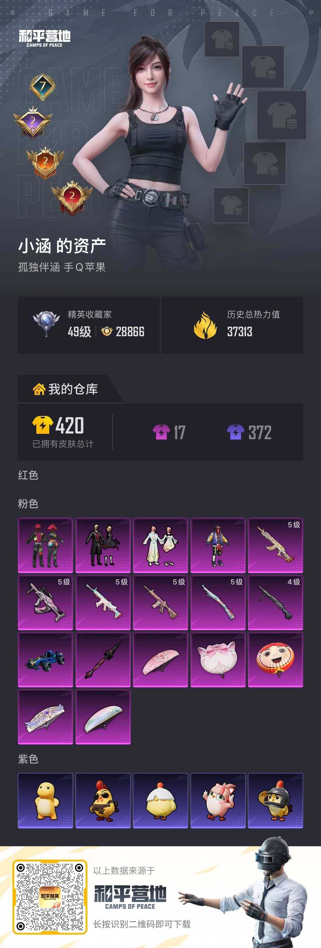 【粉色枪皮等级】:SCAR-L-锦绣绵绵(五级),M416-心之恋语(五级),GROZA-镜光银凌(五级),M762-鬼刀(五级),Kar98K-巳巳如意(五级),DP-28-豹影疾电(四级)