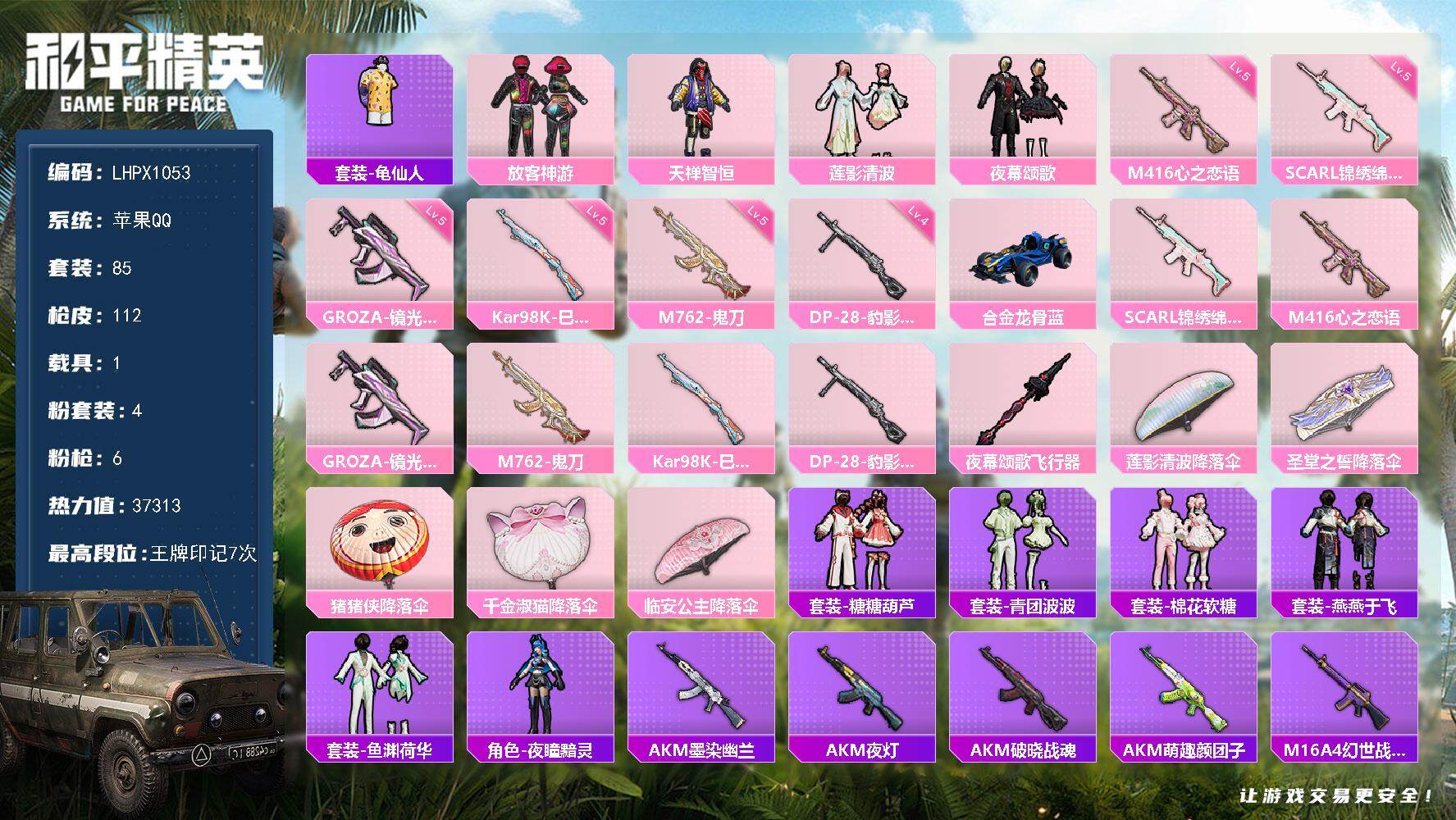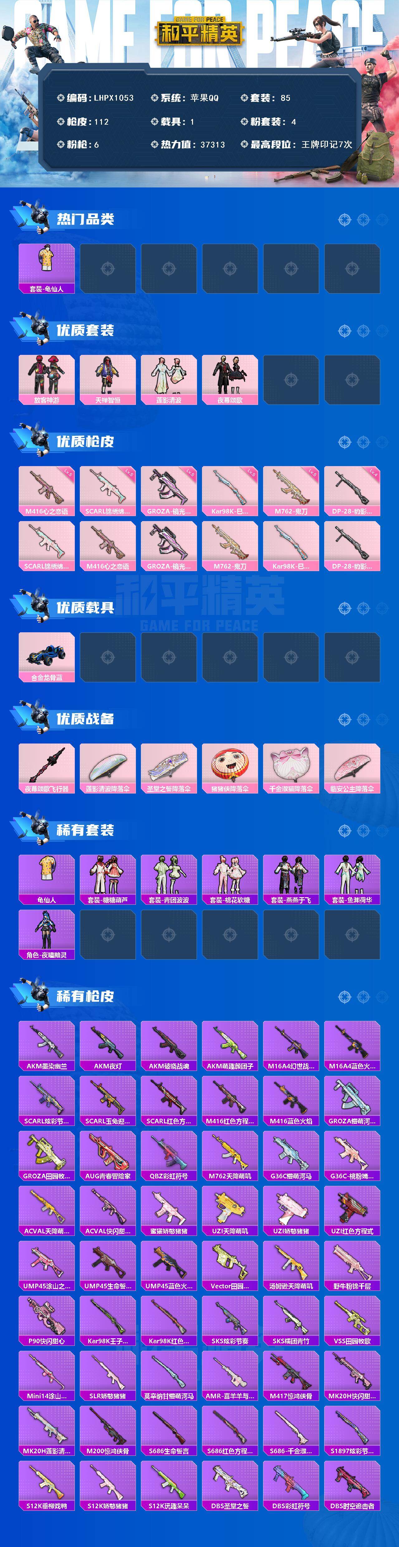 [16767707]可二次【特价出售/店主推荐】苹果 手Q-4粉装-6特效枪-1载具-1粉色飞行器-37313热力值-7王牌印记-85套装-112枪皮 【热门品类】:套装-龟仙人 【粉色套装】:粉装-放客神游,粉装-天禅智恒,粉装-莲影清波,粉装-夜幕颂歌 【粉色枪皮等级】:SCAR-L-锦绣绵绵(五级),M416-心之恋语(五级),GROZA-镜光银凌(五级),M762-鬼刀(五级),Kar98K-巳巳如意(五级),DP-28-豹影疾电(四级) 【粉色载具】:合金龙骨(蓝) 【粉色枪皮】:SCAR-L-锦绣绵绵,M416-心之恋语,GROZA-镜光银凌,M762-鬼刀,Kar98K-巳巳如意,DP-28-豹影疾电 【粉色飞行器】:夜幕颂歌飞行器 【粉色降落伞】:莲影清波降落伞,圣堂之誓降落伞,猪猪侠降落伞,千金淑猫降落伞,临安公主降落伞 【稀有套装】:套装-龟仙人,套装-糖糖葫芦,套装-青团波波,套装-棉花软糖,套装-燕燕于飞,套装-鱼渊荷华,角色-夜瞳黯灵 【稀有枪皮】:AKM-墨染幽兰,AKM-夜灯,AKM-破晓战魂,AKM-萌趣颜团子,M16A4-幻世战舞者,M16A4-蓝色火焰,SCAR-L-炫彩节奏,SCAR-L-玉兔迎春,SCAR-L-红色方程式,M416-红色方程式,M416-蓝色火焰,GROZA-懵萌河马,GROZA-田园牧歌,AUG-青春冒险家,QBZ-彩虹符号,M762-天降萌叽,G36C-懵萌河马,G36C-桃粉嫣然,AC-VAL-天降萌叽,AC-VAL-快闪甜心,蜜獾-娇憨猪猪,UZI-天降萌叽,UZI-娇憨猪猪,UZI-红色方程式,UMP45-涂山之恋,UMP45-生命誓言,UMP45-蓝色火焰,Vector-田园牧歌,汤姆逊-天降萌叽,野牛-粉锦千层,P90-快闪甜心,Kar98K-王子的夏天,Kar98K-红色方程式,SKS-炫彩节奏,SKS-糯团青竹,VSS-田园牧歌,Mini14-涂山之恋,SLR-娇憨猪猪,莫辛纳甘-懵萌河马,AMR-喜羊羊与灰太狼,M417-惊鸿侠骨,MK20-H-快闪甜心,MK20-H-莲影清波,M200-惊鸿侠骨,S686-生命誓言,S686-红色方程式,S686-千金淑猫,S1897-炫彩节奏,S12K-玩趣呆呆,S12K-垂柳戏鸭,S12K-娇憨猪猪,DBS-圣堂之誓,DBS-彩虹符号,DBS-时空追击者,SPAS-12