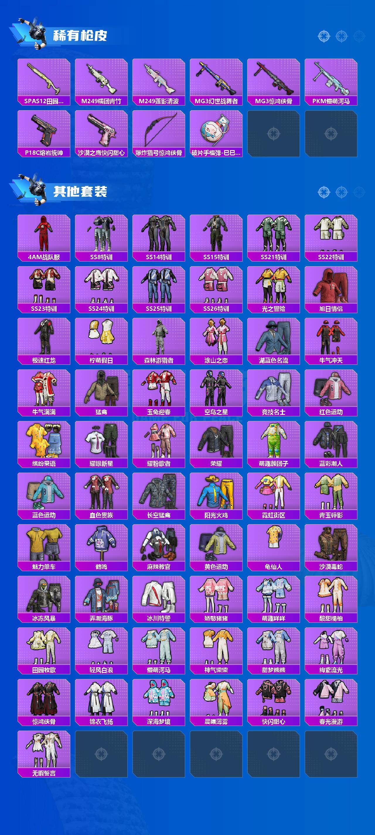 【稀有枪皮】:AKM-墨染幽兰,AKM-夜灯,AKM-破晓战魂,AKM-萌趣颜团子,M16A4-幻世战舞者,M16A4-蓝色火焰,SCAR-L-炫彩节奏,SCAR-L-玉兔迎春,SCAR-L-红色方程式,M416-红色方程式,M416-蓝色火焰,GROZA-懵萌河马,GROZA-田园牧歌,AUG-青春冒险家,QBZ-彩虹符号,M762-天降萌叽,G36C-懵萌河马,G36C-桃粉嫣然,AC-VAL-天降萌叽,AC-VAL-快闪甜心,蜜獾-娇憨猪猪,UZI-天降萌叽,UZI-娇憨猪猪,UZI-红色方程式,UMP45-涂山之恋,UMP45-生命誓言,UMP45-蓝色火焰,Vector-田园牧歌,汤姆逊-天降萌叽,野牛-粉锦千层,P90-快闪甜心,Kar98K-王子的夏天,Kar98K-红色方程式,SKS-炫彩节奏,SKS-糯团青竹,VSS-田园牧歌,Mini14-涂山之恋,SLR-娇憨猪猪,莫辛纳甘-懵萌河马,AMR-喜羊羊与灰太狼,M417-惊鸿侠骨,MK20-H-快闪甜心,MK20-H-莲影清波,M200-惊鸿侠骨,S686-生命誓言,S686-红色方程式,S686-千金淑猫,S1897-炫彩节奏,S12K-玩趣呆呆,S12K-垂柳戏鸭,S12K-娇憨猪猪,DBS-圣堂之誓,DBS-彩虹符号,DBS-时空追击者,SPAS-12