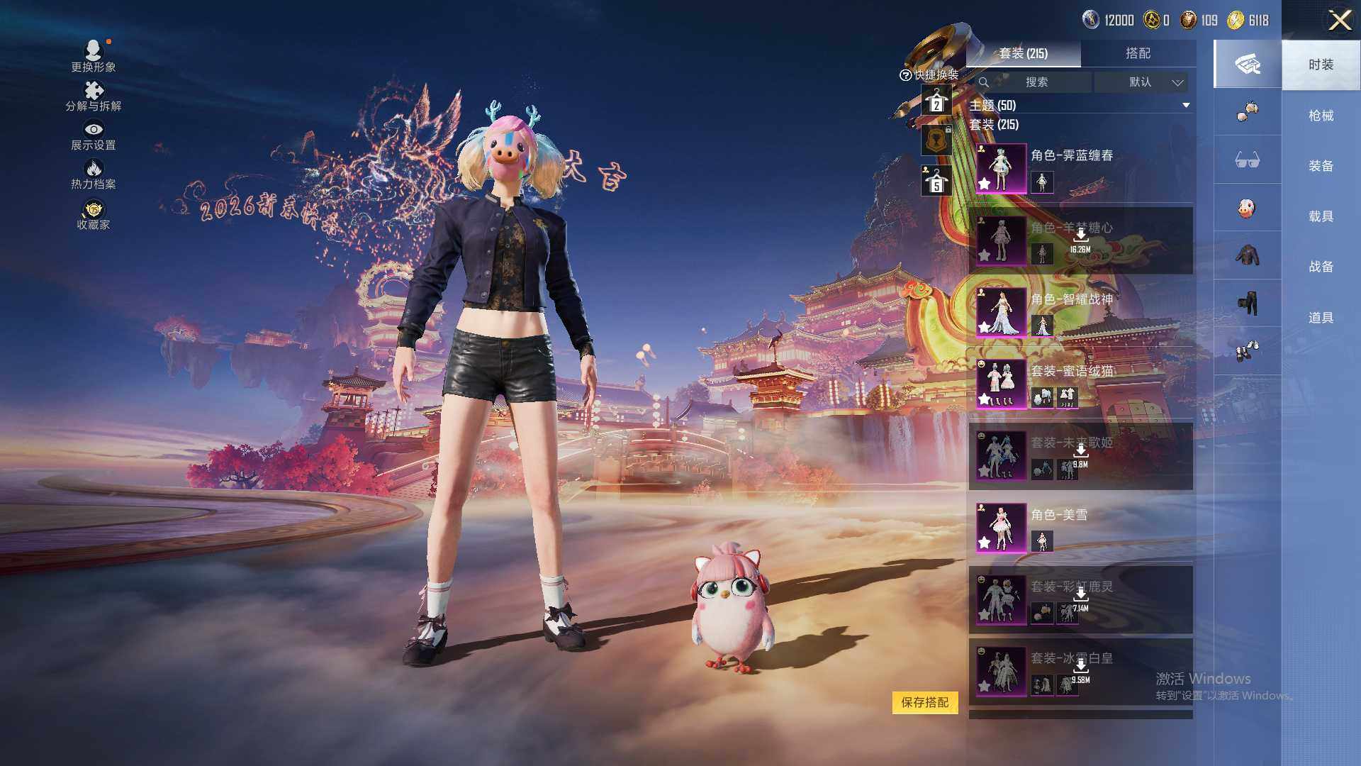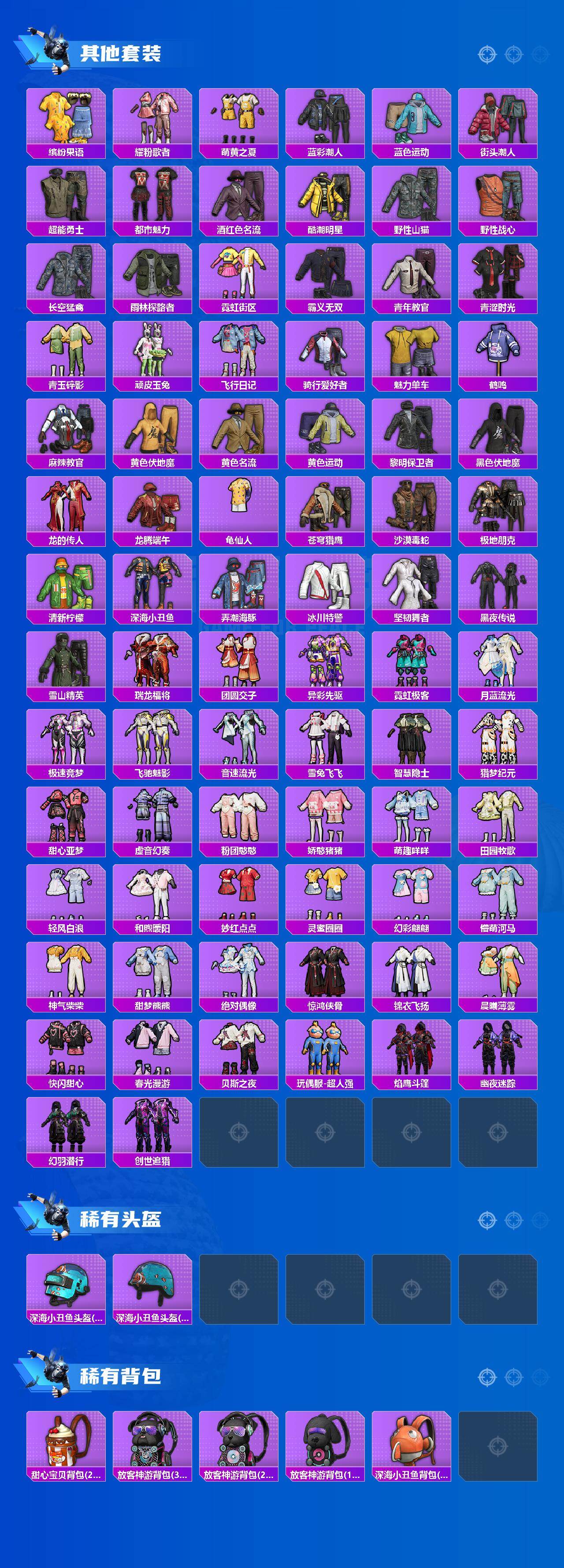 【粉色套装】:粉装-宝贝奶油派,粉装-金属狂野,粉装-缤纷油彩,粉装-新星烈龙,粉装-冰霜白皇,粉装-炙焰红王,粉装-彩虹鹿灵,粉装-未来歌姬,粉装-蜜语绒猫,角色-美雪,角色-智耀战神,角色-羊梦糖心,角色-霁蓝缠春