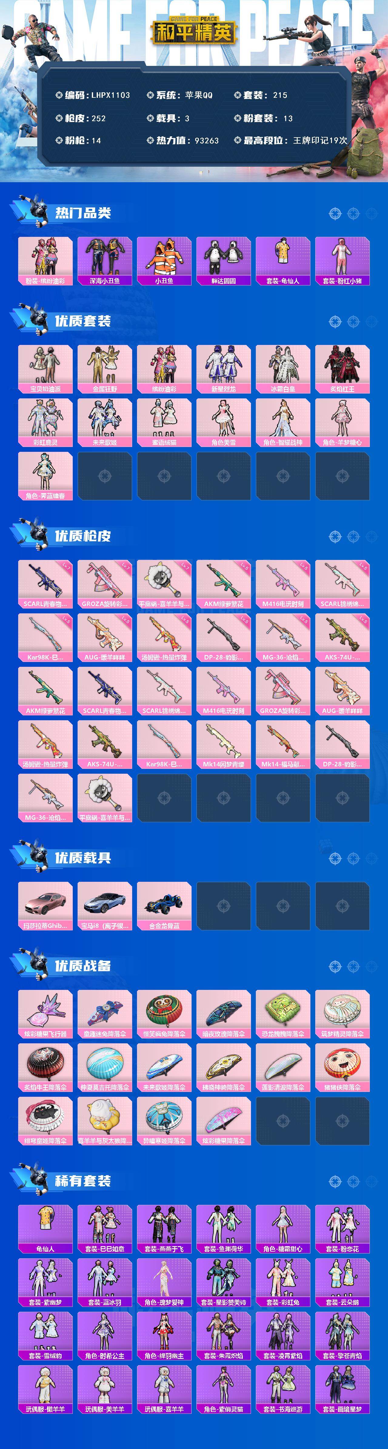 [16856844]可二次【特价出售/店主推荐】苹果 手Q-13粉装-14特效枪-3载具-1粉色飞行器-93263热力值-19王牌印记-215套装-252枪皮 【热门品类】:粉装-缤纷油彩,套装-深海小丑鱼,套装-小丑鱼,套装-胖达圆圆,套装-龟仙人,套装-粉红小猪 【粉色套装】:粉装-宝贝奶油派,粉装-金属狂野,粉装-缤纷油彩,粉装-新星烈龙,粉装-冰霜白皇,粉装-炙焰红王,粉装-彩虹鹿灵,粉装-未来歌姬,粉装-蜜语绒猫,角色-美雪,角色-智耀战神,角色-羊梦糖心,角色-霁蓝缠春 【粉色枪皮等级】:AKM-绿萝繁花(五级),SCAR-L-青春物语(七级),SCAR-L-锦绣绵绵(五级),M416-电玩时刻(五级),GROZA-旋转彩虹(七级),AUG-暖羊咩咩(五级),汤姆逊-热量炸弹(五级),AKS-74U-森灵之息(五级),Kar98K-巳巳如意(五级),DP-28-豹影疾电(五级),MG-36-沧焰双生(五级),平底锅-喜羊羊与灰太狼(七级) 【粉色载具】:玛莎拉蒂Ghibli(粉),宝马i8(离子银),合金龙骨(蓝) 【粉色枪皮】:AKM-绿萝繁花,SCAR-L-青春物语,SCAR-L-锦绣绵绵,M416-电玩时刻,GROZA-旋转彩虹,AUG-暖羊咩咩,汤姆逊-热量炸弹,AKS-74U-森灵之息,Kar98K-巳巳如意,Mk14-闲梦青缨,Mk14-福马献瑞,DP-28-豹影疾电,MG-36-沧焰双生,平底锅-喜羊羊与灰太狼 【粉色飞行器】:炫彩糖果飞行器 【粉色降落伞】:童趣迷兔降落伞,怪笑疯兔降落伞,暗夜玫瑰降落伞,恐龙拽拽降落伞,筑梦精灵降落伞,炙焰牛王降落伞,仲夏莫吉托降落伞,未来歌姬降落伞,拂晓神骑降落伞,莲影清波降落伞,猪猪侠降落伞,绯穹魔姬降落伞,喜羊羊与灰太狼降落伞,异瞳寒姬降落伞,炫彩糖果降落伞 【稀有套装】:套装-龟仙人,套装-巳巳如意,套装-雪国风尚,套装-炫彩糖果,套装-燕燕于飞,套装-鱼渊荷华,角色-糖霜甜心,套装-粉恋花,套装-紫幽梦,套装-蓝冰羽,角色-瑰梦爱神,套装-星影赞美诗,套装-彩虹兔,套装-云朵鹅,套装-雪绒豹,角色-时希公主,角色-绛羽幽主,套装-朱霞炽焰,套装-凌霄紫焰,套装-擎苍青焰,玩偶服-懒羊羊,玩偶服-美羊羊,玩偶服-喜羊羊,角色-紫俏灵猫,套装-书海巡游,套装-画境星梦,套装-琴音绮想 【稀有枪皮】:AUG-冰晶雪宝,