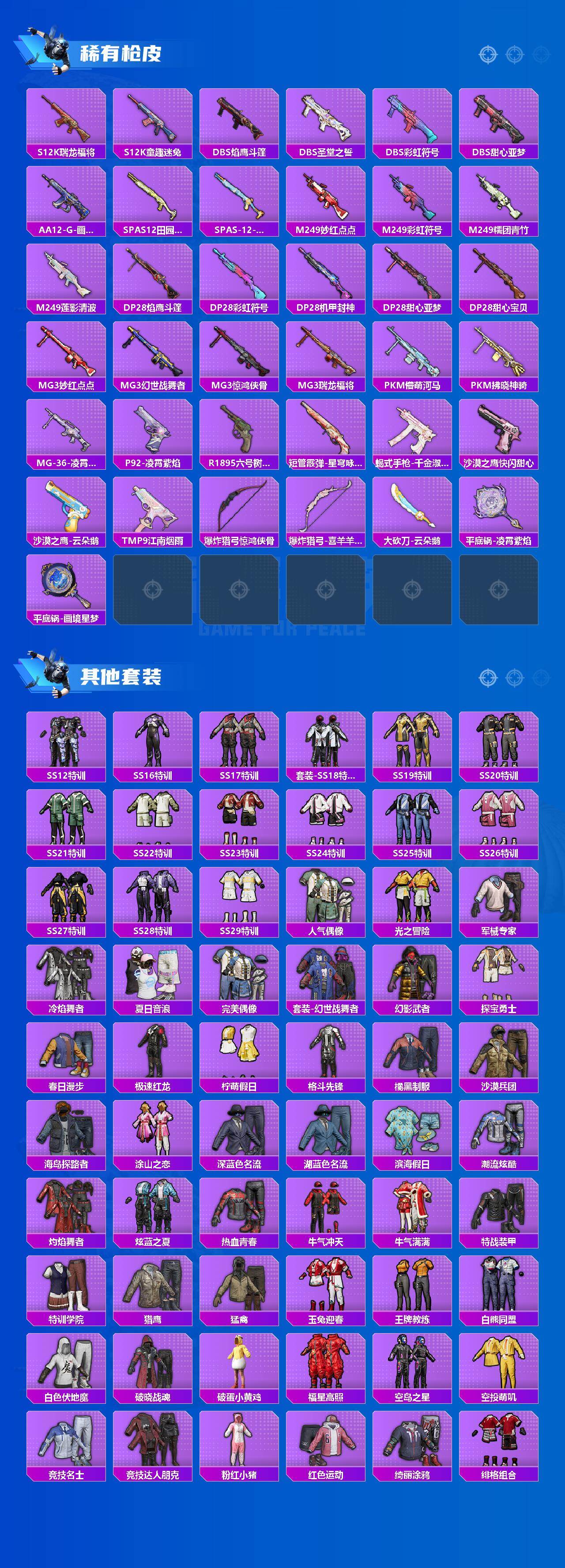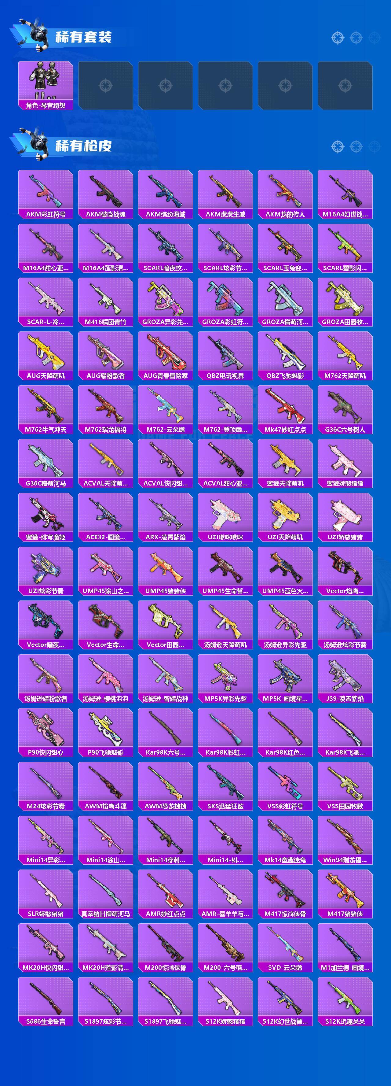 AKM-绿萝繁花,SCAR-L-青春物语,SCAR-L-锦绣绵绵,M416-电玩时刻,GROZA-旋转彩虹,AUG-暖羊咩咩,Kar98K-巳巳如意,Mk14-闲梦青缨