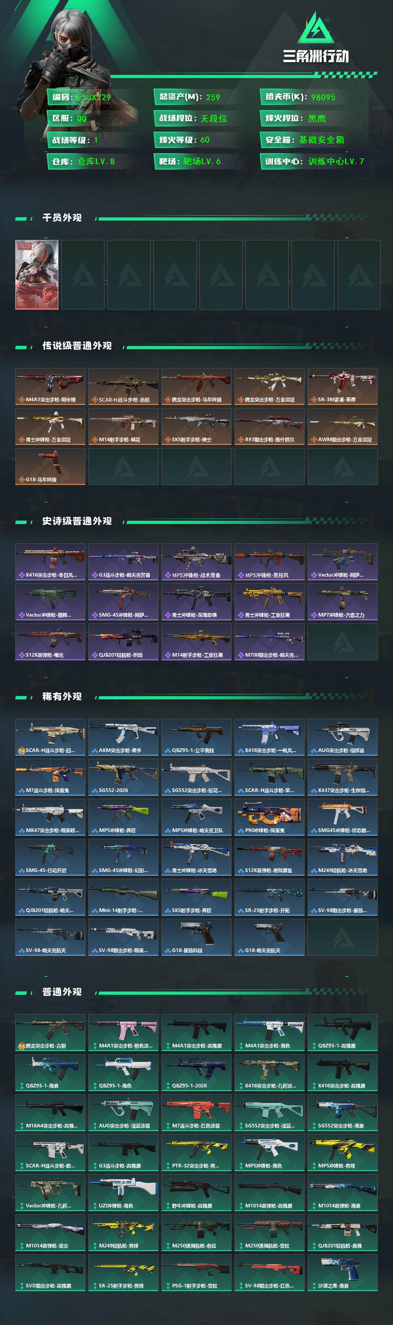 [17216035]【特价出售/店主推荐】259m总资产-98095k哈伏币-60烽火等级-黑鹰-1战场等级-无军衔 【干员外观】:骇爪-维什戴尔 【传说外观】:M4A1突击步枪-阿米娅,SCAR-H战斗步枪-启航,腾龙突击步枪-马年祥瑞,腾龙突击步枪-万金泪冠,SR-3M紧凑突击步枪-荼蘼,勇士冲锋枪-万金泪冠,M14射手步枪-缄花,SKS射手步枪-骑士,R93狙击步枪-维什戴尔,AWM狙击步枪-万金泪冠,G18-马年祥瑞 【史诗外观】:K416突击步枪-冬日风情,G3战斗步枪-哈夫克警备,MP5冲锋枪-战术竞备,MP5冲锋枪-竞技风,Vector冲锋枪-阿萨拉文明,Vector冲锋枪-猎鳄行动,SMG-45冲锋枪-阿萨拉特攻,勇士冲锋枪-深海恐惧,勇士冲锋枪-工业狂潮,MP7冲锋枪-六套之力,S12K霰弹枪-曙光,QJB201轻机枪-炽焰,M14射手步枪-工业狂潮,M700狙击步枪-哈夫克警备 【稀有外观】:SCAR-H战斗步枪-旧梦,AKM突击步枪-肃杀,QBZ95-1突击步枪-公平竞技,K416突击步枪-一帆风顺,AUG突击步枪-指挥官,M7战斗步枪-捣蛋鬼,SG552突击步枪-2026,SG552突击步枪-贴花艺术,SCAR-H战斗步枪-荣耀列队,K437突击步枪-生存指令,MK47突击步枪-精英联盟,MP5冲锋枪-弄臣,MP5冲锋枪-哈夫克卫队,P90冲锋枪-捣蛋鬼,SMG-45冲锋枪-状态很好,SMG-45冲锋枪-行动开启,SMG-45冲锋枪-幻影结构,勇士冲锋枪-冰天雪地,S12K霰弹枪-地狱黑鲨,M249轻机枪-冰天雪地,QJB201轻机枪-哈夫克卫队,Mini-14射手步枪-荣耀列队,SKS射手步枪-弄臣,SR-25射手步枪-开拓,SV-98狙击步枪-星链科技,SV-98狙击步枪-哈夫克航天,SV-98狙击步枪-精英联盟,G18-星链科技,G18-哈夫克航天 【普通外观】:腾龙突击步枪-古铜,M4A1突击步枪-粉色涂装,M4A1突击步枪-高雅黑,M4A1突击步枪-海色,QBZ95-1突击步枪-高雅黑,QBZ95-1突击步枪-海浪,QBZ95-1突击步枪-海色,QBZ95-1突击步枪-2026,K416突击步枪-几何迷彩,K416突击步枪-高雅黑,M16A4突击步枪-高雅黑,AUG突击步枪-浅蓝涂装,M7战斗步枪-红色涂装,SG552突击步枪-浅蓝涂装,SG552突