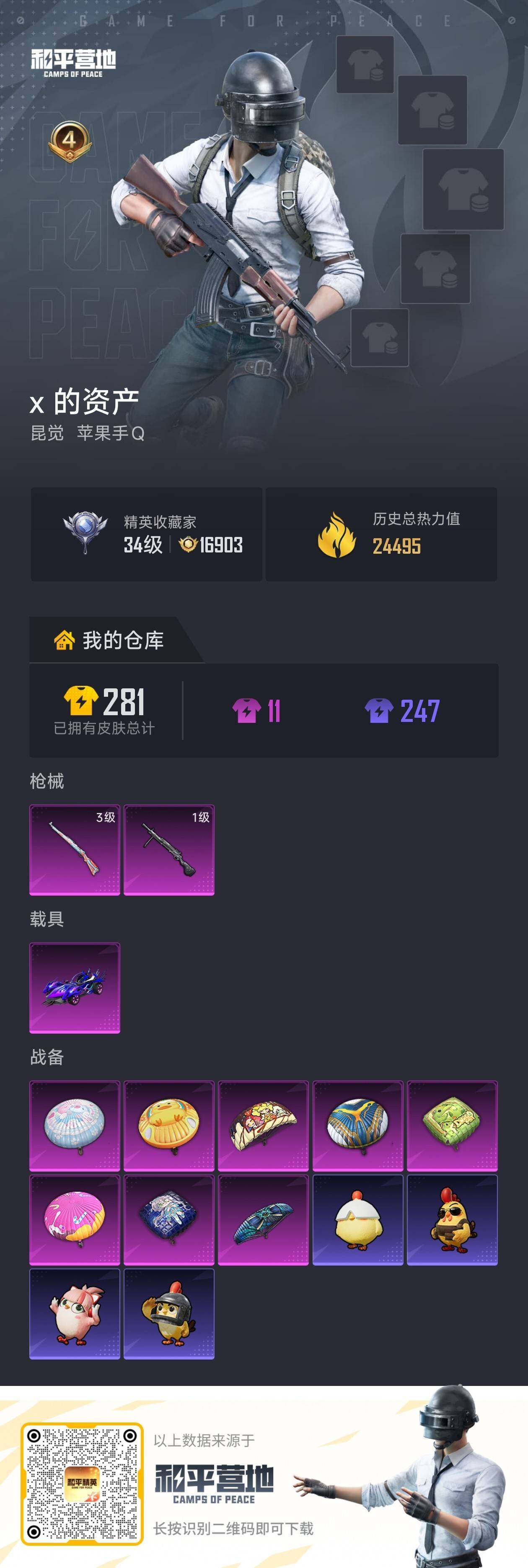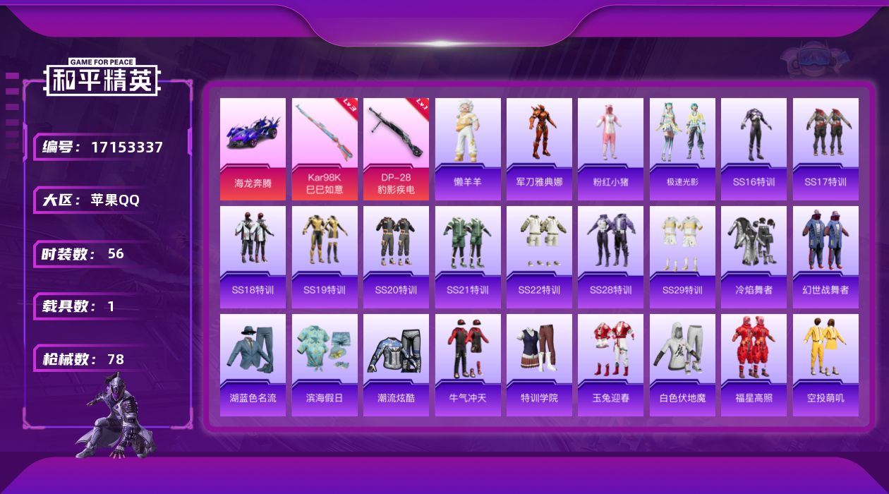 [17153337]【特价出售/店主推荐】苹果 手Q-2特效枪-1载具-2。4w热力值-4王牌印记-56套装-78枪皮