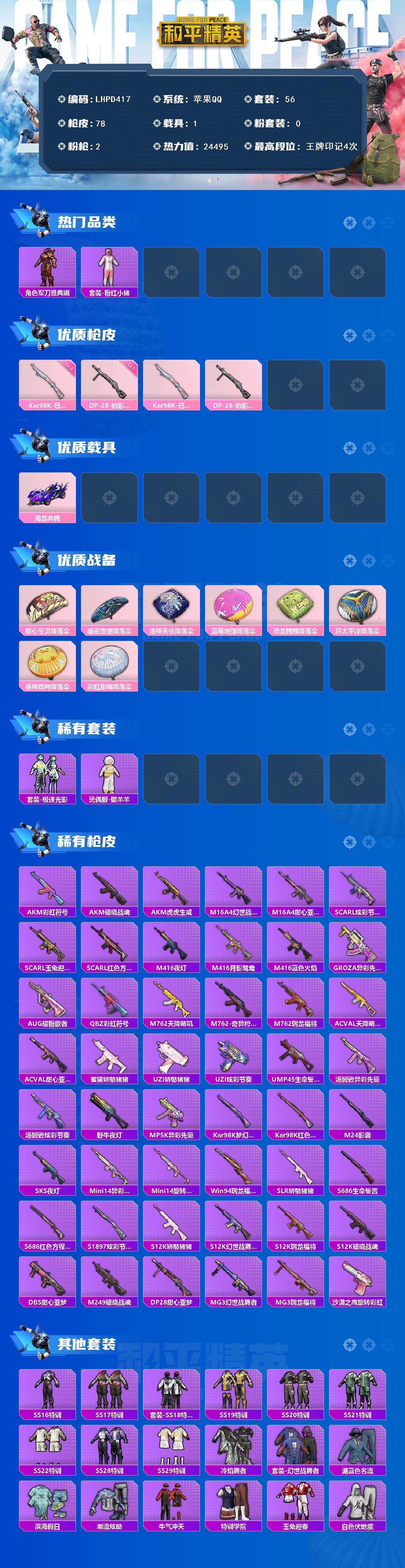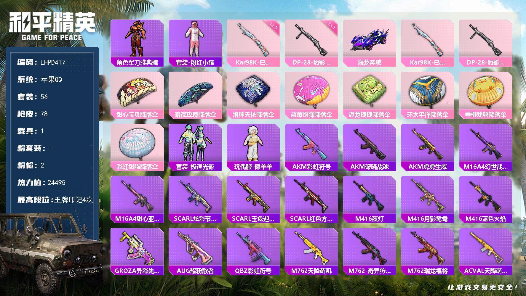 [17153337]【特价出售/店主推荐】苹果 手Q-2特效枪-1载具-2。4w热力值-4王牌印记-56套装-78枪皮 【热门品类】:角色-军刀雅典娜,套装-粉红小猪 【粉色枪皮等级】:Kar98K-巳巳如意(三级),DP-28-豹影疾电(一级) 【粉色载具】:海龙奔腾 【粉色枪皮】:Kar98K-巳巳如意,DP-28-豹影疾电 【粉色降落伞】:甜心宝贝降落伞,暗夜玫瑰降落伞,洛神天依降落伞,蓝莓炮弹降落伞,恐龙拽拽降落伞,环太平洋降落伞,垂柳戏鸭降落伞,彩虹甜喵降落伞 【稀有套装】:套装-极速光影,玩偶服-懒羊羊 【稀有枪皮】:AKM-彩虹符号,AKM-破晓战魂,AKM-虎虎生威,M16A4-幻世战舞者,M16A4-甜心亚梦,SCAR-L-炫彩节奏,SCAR-L-玉兔迎春,SCAR-L-红色方程式,M416-夜灯,M416-月影鸳鸯,M416-蓝色火焰,GROZA-异彩先驱,AUG-耀粉歌者,QBZ-彩虹符号,M762-天降萌叽,M762-奇异狩猎者,M762-瑞龙福将,AC-VAL-天降萌叽,AC-VAL-甜心亚梦,蜜獾-娇憨猪猪,UZI-娇憨猪猪,UZI-炫彩节奏,UMP45-生命誓言,汤姆逊-异彩先驱,汤姆逊-炫彩节奏,野牛-夜灯,MP5K-异彩先驱,Kar98K-梦幻火箭,Kar98K-红色方程式,M24-影袭,SKS-夜灯,Mini14-异彩先驱,Mini14-旋转彩虹,Win94-瑞龙福将,SLR-娇憨猪猪,S686-生命誓言,S686-红色方程式,S1897-炫彩节奏,S12K-瑞龙福将,S12K-破晓战魂,S12K-娇憨猪猪,S12K-幻世战舞者,DBS-甜心亚梦,M249-破晓战魂,DP-28-甜心亚梦,MG3-幻世战舞者,MG3-瑞龙福将,沙漠之鹰-旋转彩虹 【其他套装】:套装-SS16特训,套装-SS17特训,套装-SS18特训,套装-SS19特训,套装-SS20特训,套装-SS21特训,套装-SS22特训,套装-SS28特训,套装-SS29特训,套装-冷焰舞者,套装-幻世战舞者,套装-湖蓝色名流,套装-滨海假日,套装-潮流炫酷,套装-牛气冲天,套装-特训学院,套装-玉兔迎春,套装-白色伏地魔,套装-福星高照,套装-空投萌叽,套装-竞技名士,套装-粉红小猪,套装-绮丽涂鸦,套装-缤纷果语,套装-虎虎生威吉莉,套装-长空猛禽,套装-青玉碎影,套装-鹤鸣,套装-黄