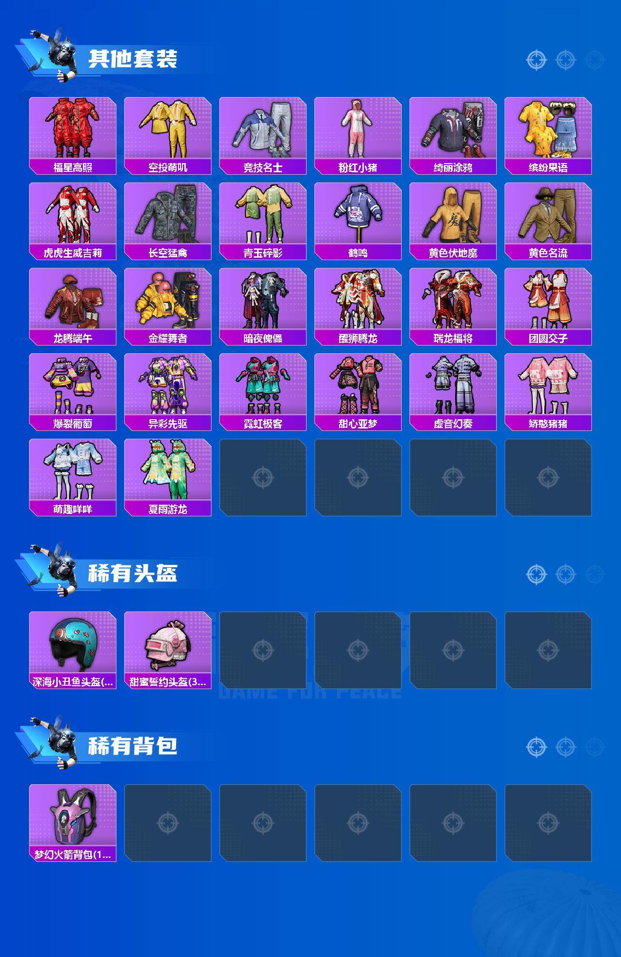 - [12904301]苹果 手Q-11粉装-8特效枪-3载具-2粉色飞行器-83190热力值-6王牌印记-200套装-250枪皮 【热门品类】:粉装-梦幻火箭,角色-军刀雅典娜,套装-龟仙人,套装-潮萌小黄鸭,套装-浪漫波比,小恶魔头饰,熔岩游骑兵面罩,熔岩游骑兵连帽夹克 【粉色载具】:特斯拉Model 3(珍珠白),兰博基尼URUS(明艳黄),合金龙骨(绿) 【粉色套装】:粉装-蝶舞迷情,粉装-梦幻火箭,粉装-潮汐统领,粉装-恐龙拽拽,粉装-蜜语绒猫,角色-严莉莉,角色-小蓝,角色-美雪,角色-美琪,角色-初号机 觉醒Ver.,角色-千金淑猫 【粉色枪皮等级】:SCAR-L-锦绣绵绵(五级),M416-电玩时刻(五级),汤姆逊-热量炸弹(五级),Kar98K-巳巳如意(五级),M24-镜域双华(三级),Mk14-甜梦熊击(五级),DP-28-豹影疾电(四级),MG3-洛神天依(七级) 【粉色枪皮】:SCAR-L-锦绣绵绵,M416-电玩时刻,汤姆逊-热量炸弹,Kar98K-巳巳如意,M24-镜域双华,Mk14-甜梦熊击,DP-28-豹影疾电,MG3-洛神天依 【粉色飞行器】:炫紫旋律飞行器,镜域双华-灵镜之阶 【粉色降落伞】:快乐主宰降落伞,春暖花开降落伞,梦幻火箭降落伞,金风玉露降落伞,炫紫旋律降落伞,神秘黑猫降落伞,银刃赛罗降落伞,洛神天依降落伞,绿意幻情降落伞,旋转彩虹降落伞,镜域双华降落伞,江南烟雨降落伞,巴啦啦小魔仙降落伞 【稀有套装】:套装-龟仙人,套装-巳巳如意,套装-雏菊兔兔,套装-萝兰蝴蝶,套装-小熊娃娃,套装-粉恋花,套装-紫幽梦,套装-蓝冰羽,套装-星影赞美诗,套装-彩虹兔,套装-云朵鹅,套装-雪绒豹,套装-蜜露汐语,套装-朱霞炽焰,套装-凌霄紫焰 【稀有枪皮】:AKM-冰凉西瓜,AKM-奇异狩猎者,AKM-星之彼岸,AKM-玉龙,AKM-破晓战魂,AKM-虎虎生威,AKM-霓虹街区,M16A4-幻世战舞者,M16A4-星际漫游,M16A4-生命誓言,M16A4-红色方程式,SCAR-L-炫彩节奏,SCAR-L-玉兔迎春,SCAR-L-红色方程式,SCAR-L-雷霆特警,M416-仓鼠灰灰,M416-红色方程式,M416-绯红前夜,M416-蓝色火焰,M416-魔法学院,GROZA-异彩先驱,GROZA-蓝莓炮弹,GROZA-雷霆特警,GROZA-黑色刀锋,AU