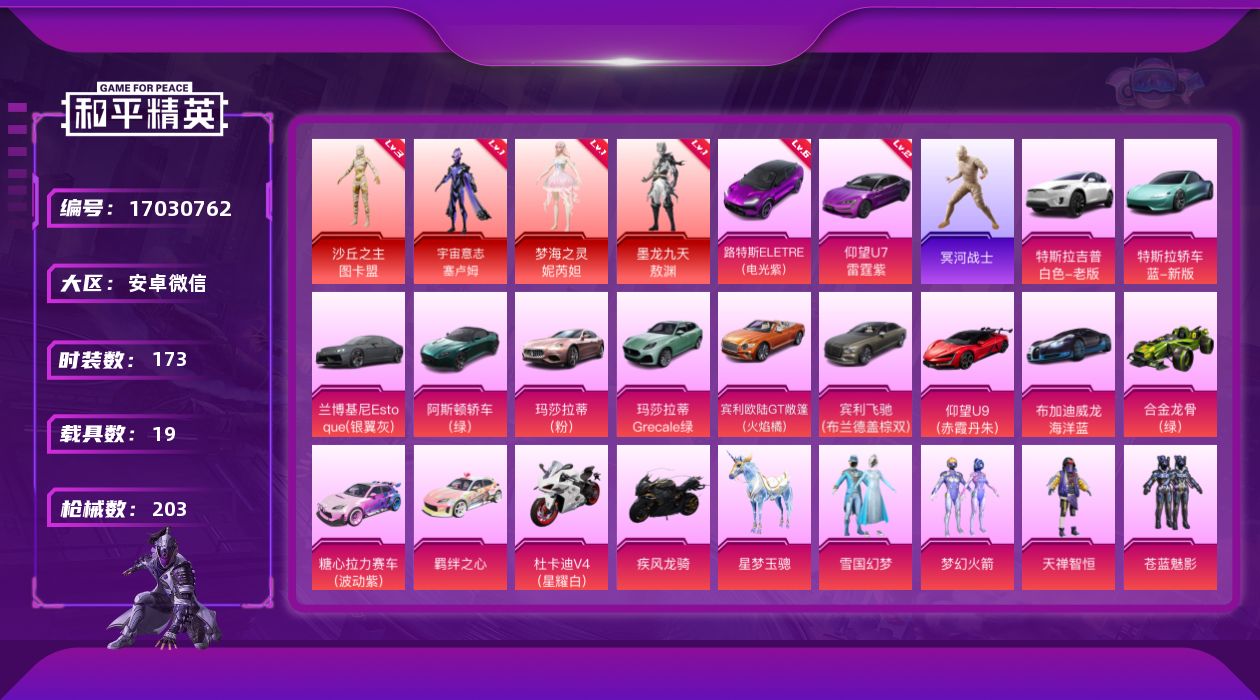 [17030762]【特价出售/店主推荐】安卓 微信-4神装-15粉装-9特效枪-19载具-10粉色飞行器-100557热力值-8王牌印记-173套装-203枪皮【红色载具】:路特斯ELETRE(电光紫)(六级),仰望U7(雷霆紫)(二级)【红色神装等级】:宇宙意志-塞卢姆(一级),梦海之灵-妮芮妲(一级),墨龙九天-敖渊(一级),沙丘之主-图卡盟(三级)【红色角色神装】:宇宙意志-塞卢姆,梦海之灵-妮芮妲,墨龙九天-敖渊,沙丘之主-图卡盟【热门品类】:粉装-雪国幻梦,粉装-梦幻火箭,套装-冥河战士,套装-金羽特工,套装-SS1特训,套装-浪漫波比,角色-8号机,角色-Mark.06,熔岩游骑兵连帽夹克【粉色套装】:粉装-雪国幻梦,粉装-梦幻火箭,粉装-天禅智恒,粉装-苍蓝魅影,粉装-冰霜白皇,粉装-齐天大圣,角色-严莉莉,角色-美雪,角色-美琪,角色-脉冲星,角色-电磁星,角色-光极星,角色-鸢尾晶梦,角色-星梦奇缘,角色-初号机 觉醒Ver.【粉色枪皮等级】:M416-心之恋语(七级),M416-电玩时刻(四级),M416-墨龙九天(三级),AUG-星梦奇缘(三级),UMP45-雪国精灵(三级),UMP45-量子极限(五级),P90-沙丘之主(三级),Kar98K-巳巳如意(五级),M200-梦海之灵(三级)【粉色载具】:特斯拉Model X(珍珠白),特斯拉Roadster(水滴蓝),兰博基尼Estoque(银翼灰),阿斯顿马丁DBS(绿),路特斯ELETRE(电光紫),玛莎拉蒂Ghibli(粉),玛莎拉蒂Grecale(薄荷绿),宾利欧陆GT敞篷(火焰橘),宾利飞驰(布罗德盖棕双色),仰望U9(赤霞丹朱),仰望U7(雷霆紫),布加迪威龙(海洋蓝),合金龙骨(绿),糖心拉力赛车(波动紫),羁绊之心,杜卡迪 Panigale V4(星耀白),疾风龙骑,空客H135-蔚蓝之翼,星梦玉骢【粉色枪皮】:M416-心之恋语,M416-电玩时刻,M416-墨龙九天,AUG-星梦奇缘,UMP45-雪国精灵,UMP45-量子极限,P90-沙丘之主,Kar98K-巳巳如意,M200-梦海之灵【粉色飞行器】:酣梦熊熊飞行器,齐天大圣飞行器,沙丘之主天马,镜域双华-灵镜之阶,鎏金朋克飞行器,巴啦啦小魔仙飞行器,龙翔九天飞行器,幻海精灵飞行器,星梦奇缘飞行器,深渊漩涡飞行器