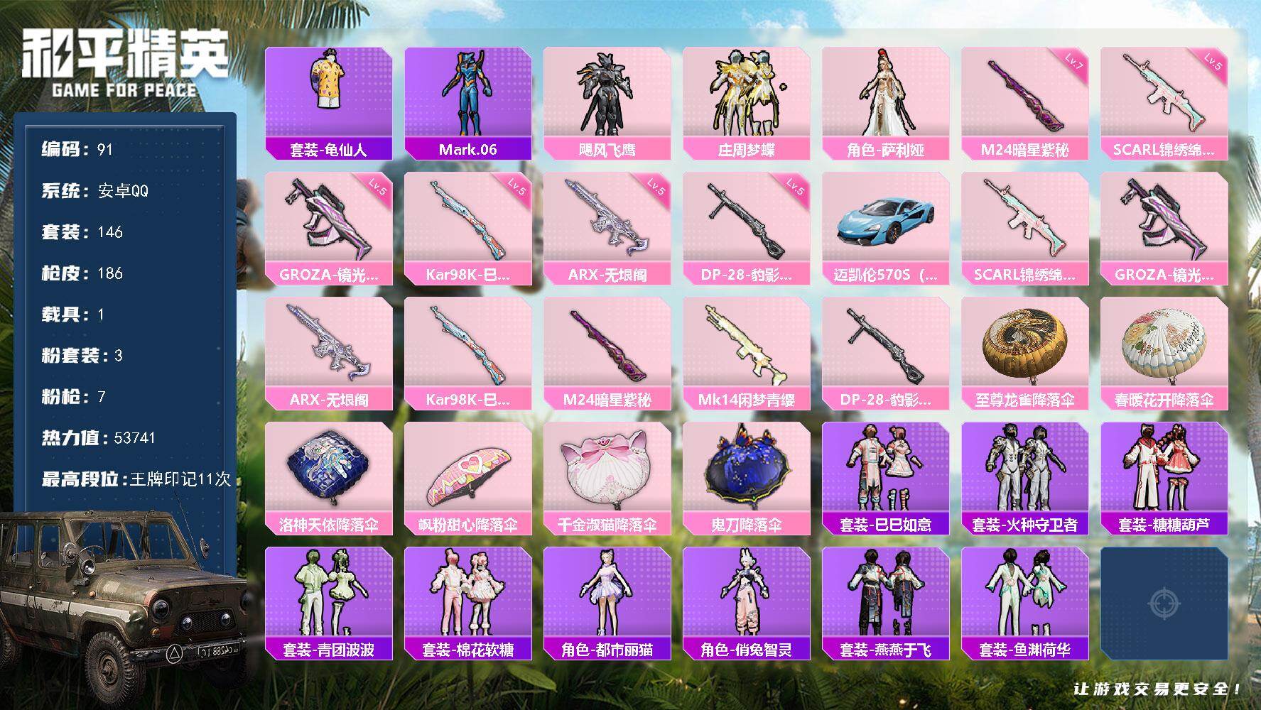 [17217111]安卓 手Q-3粉装-7特效枪-1载具-0粉色飞行器-53741热力值-11王牌印记-146套装-186枪皮