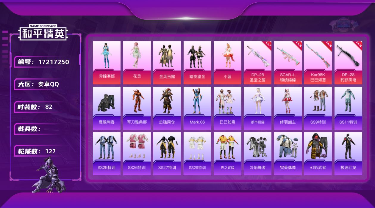 [17217250]安卓 手Q-5粉装-4特效枪-0载具-4粉色飞行器-36823热力值-5王牌印记-82套装-127枪皮