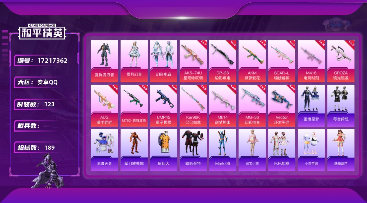 [17217362]安卓 手Q-3粉装-14特效枪-0载具-3粉色飞行器-54930热力值-7王牌印记-123套装-189枪皮 【热门品类】:套装-浪漫天命,角色-军刀雅典娜,套装-龟仙人,套装-暗影哥特,角色-Mark.06 【粉色套装】:角色-复仇流浪者,粉装-雪月幻音,粉装-幻彩电音 【粉色枪皮等级】:AKM-绿萝繁花(五级),SCAR-L-锦绣绵绵(五级),M416-电玩时刻(五级),GROZA-镜光银凌(五级),AUG-暖羊咩咩(五级),M762-青锋波束(五级),UMP45-量子极限(五级),Vector-环太平洋(四级),AKS-74U-星穹咏叹调(七级),AKS-74U-森灵之息(四级),Kar98K-巳巳如意(五级),Mk14-甜梦熊击(五级),DP-28-豹影疾电(五级),MG-36-幻彩电音(五级) 【粉色枪皮】:AKM-绿萝繁花,SCAR-L-锦绣绵绵,M416-电玩时刻,GROZA-镜光银凌,AUG-暖羊咩咩,M762-青锋波束,UMP45-量子极限,Vector-环太平洋,AKS-74U-星穹咏叹调,AKS-74U-森灵之息,Kar98K-巳巳如意,Mk14-甜梦熊击,DP-28-豹影疾电,MG-36-幻彩电音 【粉色飞行器】:极意拳锋飞行器 【粉色降落伞】:花间之火降落伞,洛神天依降落伞,环太平洋降落伞,圣堂之誓降落伞,精灵梦叶罗丽降落伞,临安公主降落伞,鬼刀降落伞,彩虹独角兽降落伞,月下星之子降落伞,星穹咏叹调降落伞,幻彩电音降落伞,炫彩糖果降落伞 【稀有套装】:套装-龟仙人,套装-绒宝小鹅,套装-巳巳如意,套装-小鸟芋圆,套装-炫彩糖果,套装-糖糖葫芦,套装-青团波波,套装-棉花软糖,角色-俏兔智灵,套装-燕燕于飞,套装-鱼渊荷华,角色-糖霜甜心,套装-粉恋花,套装-紫幽梦,套装-蓝冰羽,套装-霓虹热舞,套装-极速光影,套装-彩虹兔,套装-云朵鹅,套装-雪绒豹,套装-画境星梦,套装-琴音绮想 【稀有枪皮】:AUG-冰晶雪宝,AKM-彩虹符号,AKM-星之彼岸,AKM-环太平洋,AKM-生命誓言,AKM-破晓战魂,AKM-缤纷海域,AKM-虎虎生威,AKM-霓虹街区,AKM-龙的传人,M16A4-幻世战舞者,SCAR-L-夜灯,SCAR-L-炫彩节奏,SCAR-L-玉兔迎春,M416-糯团青竹,M416-红色方程式,M416-蓝色火焰,AUG-幻影战神
