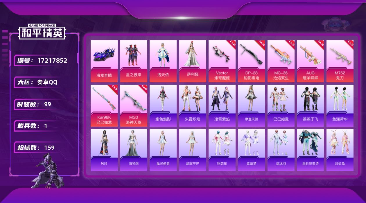 [17217852]安卓 手Q-3粉装-8特效枪-1载具-1粉色飞行器-45186热力值-10王牌印记-99套装-159枪皮 【粉色套装】:粉装-星之彼岸,角色-洛天依,角色-萨利娅 【粉色枪皮等级】:AUG-暖羊咩咩(五级),M762-鬼刀(五级),Vector-绯穹魔姬(六级),AKS-74U-森灵之息(五级),Kar98K-巳巳如意(五级),DP-28-豹影疾电(五级),MG3-洛神天依(五级),MG-36-沧焰双生(五级) 【粉色载具】:海龙奔腾 【粉色枪皮】:AUG-暖羊咩咩,M762-鬼刀,Vector-绯穹魔姬,AKS-74U-森灵之息,Kar98K-巳巳如意,DP-28-豹影疾电,MG3-洛神天依,MG-36-沧焰双生 【粉色降落伞】:洛神天依降落伞,第五大道降落伞,鬼刀降落伞,异瞳寒姬降落伞,炫彩糖果降落伞 【稀有套装】:套装-摩登天骄,套装-巳巳如意,套装-雪国风尚,套装-炫彩糖果,套装-燕燕于飞,套装-鱼渊荷华,角色-风玲,角色-海琴烟,套装-晶灵使者,套装-晶辉守护,套装-粉恋花,套装-紫幽梦,套装-蓝冰羽,套装-星影赞美诗,套装-彩虹兔,套装-云朵鹅,套装-雪绒豹,套装-朱霞炽焰,套装-凌霄紫焰,角色-绯色魅影 【稀有枪皮】:M79短管榴弹-钛晶裂爪,AUG-冰晶雪宝,AKM-彩虹符号,AKM-灼热熔岩,AKM-破晓战魂,M16A4-幻世战舞者,SCAR-L-夜灯,SCAR-L-玉兔迎春,SCAR-L-红色方程式,M416-红色方程式,M416-蓝色火焰,GROZA-彩虹符号,GROZA-恐龙拽拽,GROZA-田园牧歌,GROZA-荧海星豚,GROZA-晶梦幻蝶,AUG-耀粉歌者,M762-天降萌叽,M762-彩虹符号,M762-云朵鹅,M762-登顶巅峰,AC-VAL-天降萌叽,蜜獾-天降萌叽,ARX-凌霄紫焰,UZI-炫彩节奏,UZI-红色方程式,UZI-魔药课室,UMP45-夜灯,UMP45-炫光之旅,UMP45-蓝色火焰,Vector-田园牧歌,汤姆逊-暗夜鎏金,汤姆逊-炫彩节奏,汤姆逊-智耀战神,AKS-74U-鬼刀,JS9-凌霄紫焰,P90-巳巳如意,M24-炫彩节奏,SKS-炫彩节奏,VSS-田园牧歌,Win94-晶梦幻蝶,AMR-鬼刀,MK20-H-启明星,SVD-云朵鹅,S686-生命誓言,S686-时光之誓,S686-巳巳如意,S1897