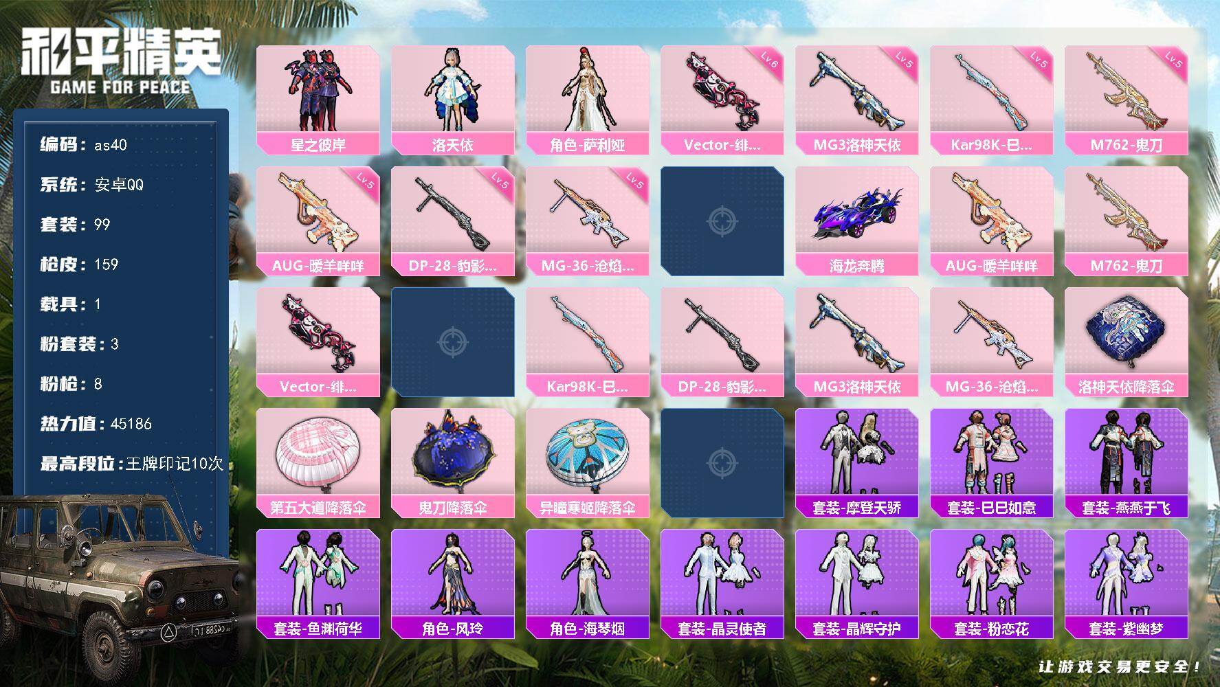 [17217852]安卓 手Q-3粉装-8特效枪-1载具-1粉色飞行器-45186热力值-10王牌印记-99套装-159枪皮