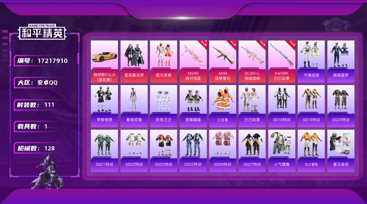 [17217910]安卓 手Q-2粉装-5特效枪-1载具-1粉色飞行器-39883热力值-6王牌印记-111套装-128枪皮 【热门品类】:套装-小丑鱼 【粉色套装】:粉装-星夜魔法师,粉装-霞光圣骑 【粉色枪皮等级】:AKM-绿萝繁花(五级),SCAR-L-锦绣绵绵(五级),AKS-74U-森灵之息(五级),Kar98K-巳巳如意(五级),M249-绝对恒星(五级) 【粉色载具】:路特斯EVIJA(星际黄) 【粉色枪皮】:AKM-绿萝繁花,SCAR-L-锦绣绵绵,AKS-74U-森灵之息,Kar98K-巳巳如意,M249-绝对恒星 【粉色降落伞】:绝对恒星降落伞,暗星紫秘降落伞,青春物语降落伞,百合蜜语降落伞,无垠阁降落伞,异瞳寒姬降落伞,炫彩糖果降落伞 【稀有套装】:套装-巳巳如意,套装-雪国风尚,套装-炫彩糖果,角色-紫俏灵猫,套装-书海巡游,套装-画境星梦,套装-琴音绮想 【稀有枪皮】:AUG-冰晶雪宝,AKM-彩虹符号,AKM-灼热熔岩,AKM-破晓战魂,AKM-缤纷海域,AKM-龙的传人,M16A4-幻世战舞者,M16A4-甜心亚梦,M16A4-红色方程式,M16A4-蓝色火焰,SCAR-L-炫彩节奏,SCAR-L-玉兔迎春,SCAR-L-红色方程式,M416-糯团青竹,M416-红色方程式,M416-蓝色火焰,GROZA-异彩先驱,GROZA-青春物语,AUG-天降萌叽,AUG-耀粉歌者,QBZ-彩虹符号,QBZ-飞驰魅影,M762-天降萌叽,M762-彩虹符号,M762-牛气冲天,M762-登顶巅峰,G36C-青丘仙客,AC-VAL-天降萌叽,AC-VAL-甜心亚梦,蜜獾-天降萌叽,ACE32-画境星梦,UZI-啾咪啾咪,UZI-炫彩节奏,UMP45-涂山之恋,UMP45-蓝色火焰,Vector-彩虹符号,Vector-生命誓言,Vector-百合蜜语,汤姆逊-天降萌叽,汤姆逊-奇异狩猎者,汤姆逊-异彩先驱,MP5K-异彩先驱,MP5K-画境星梦,P90-飞驰魅影,P90-巳巳如意,Kar98K-彩虹符号,Kar98K-炫彩节奏,Kar98K-红色方程式,Kar98K-飞驰魅影,M24-炫彩节奏,AWM-圣堂之誓,SKS-炫彩节奏,Mini14-异彩先驱,Mini14-炫彩节奏,SLR-彩虹符号,莫辛纳甘-炙焰牛王,M417-惊鸿侠骨,M200-惊鸿侠骨,M1加兰德-