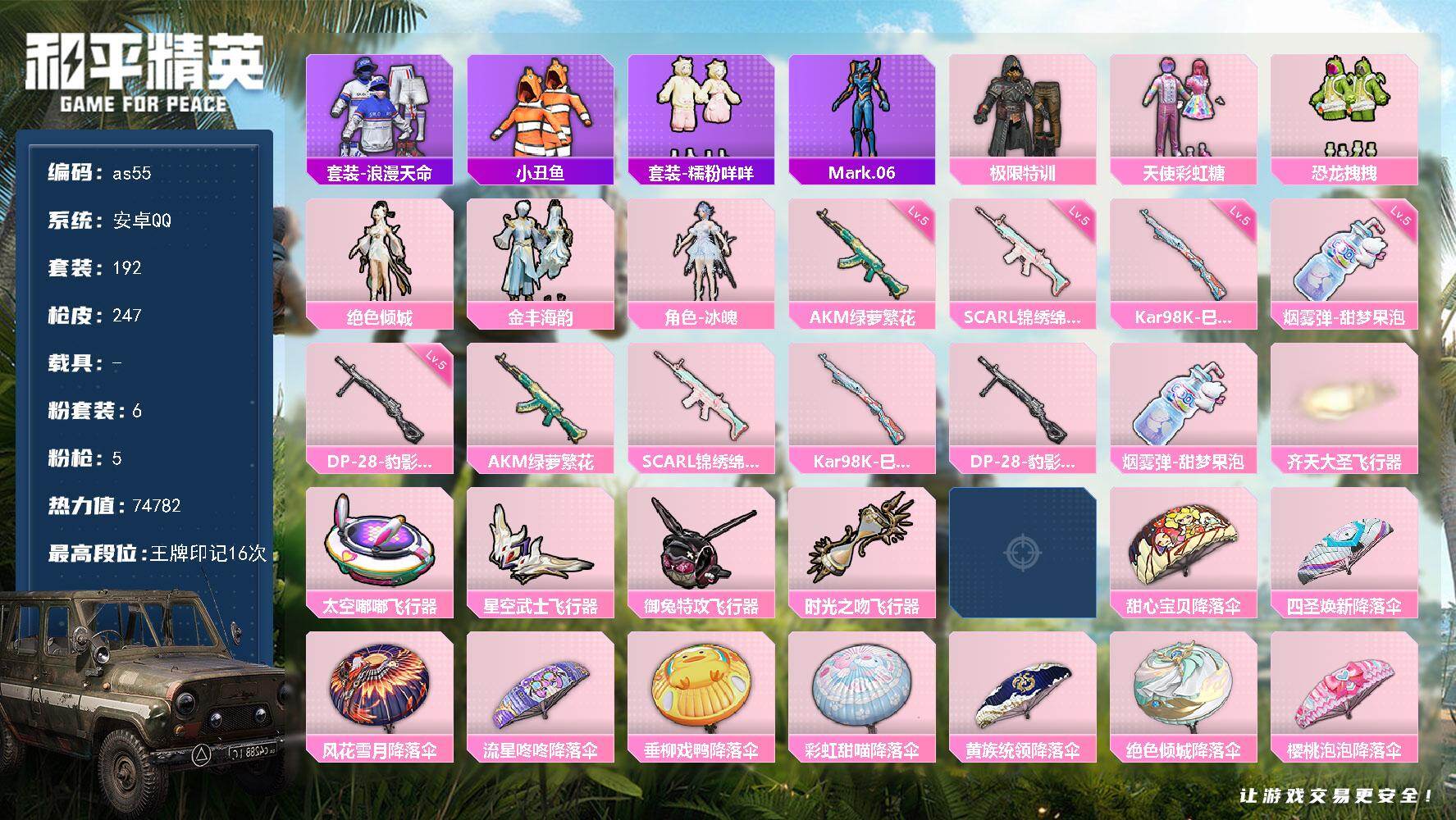 [17218044]安卓 手Q-6粉装-5特效枪-0载具-6粉色飞行器-74782热力值-16王牌印记-192套装-247枪皮