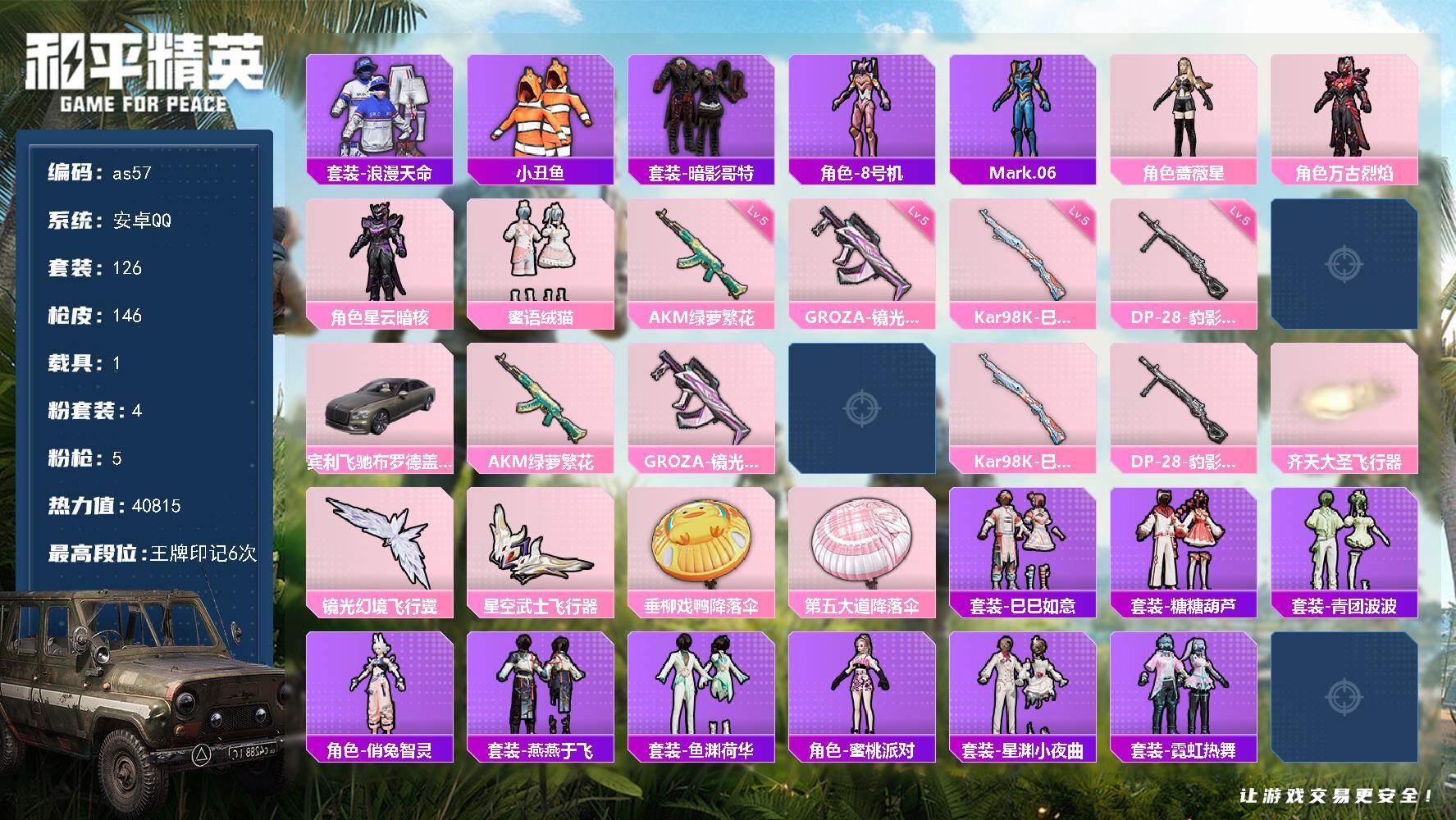 [17218063]安卓 手Q-4粉装-5特效枪-1载具-3粉色飞行器-40815热力值-6王牌印记-126套装-146枪皮