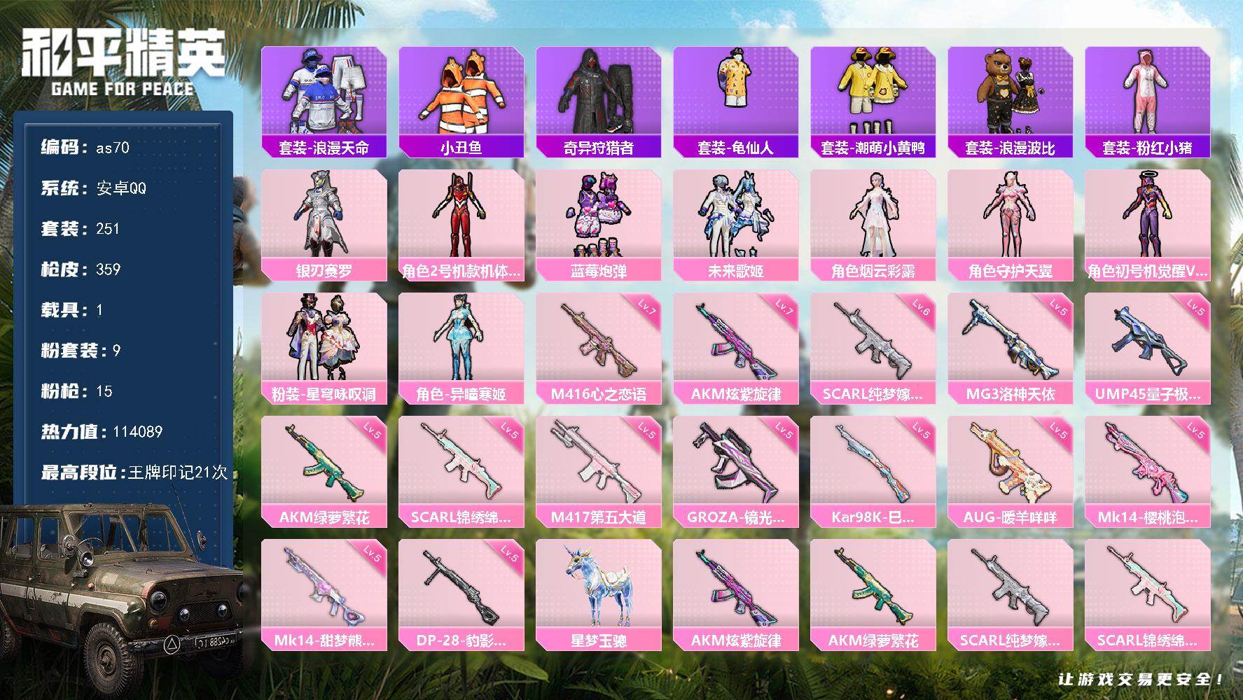[17218116]安卓 手Q-9粉装-15特效枪-1载具-2粉色飞行器-114089热力值-21王牌印记-251套装-359枪皮