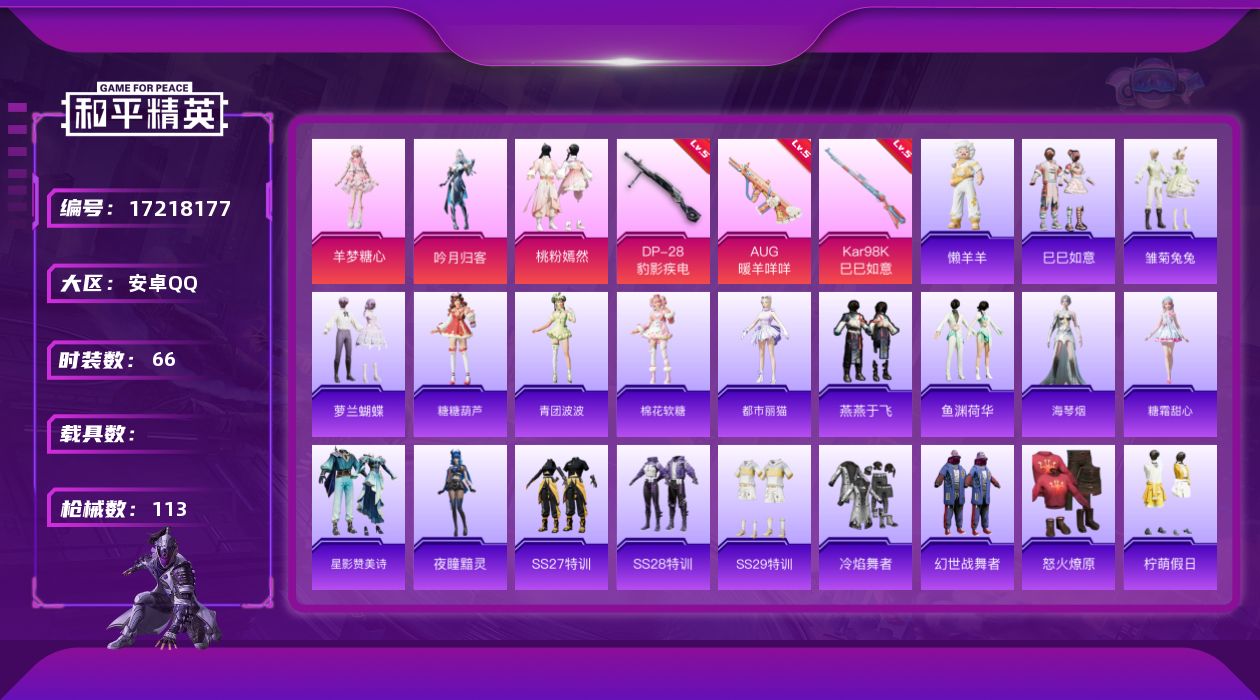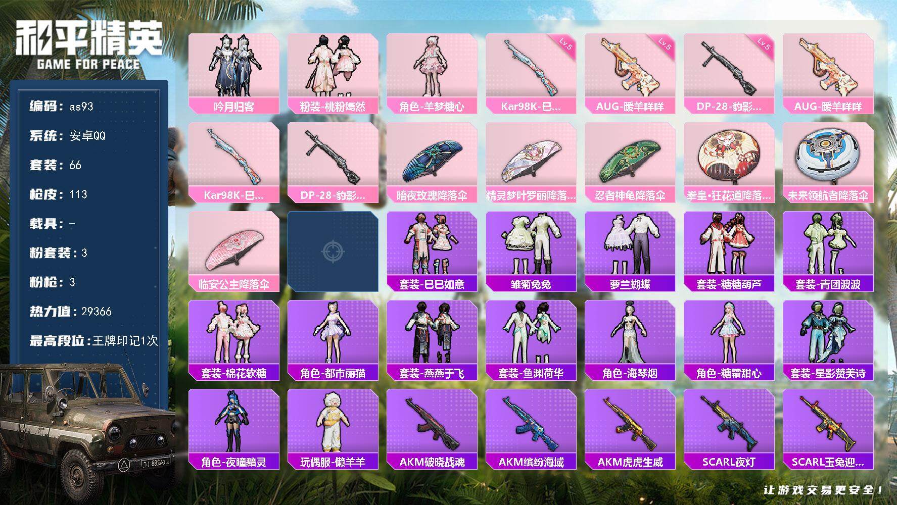 [17218177]安卓 手Q-3粉装-3特效枪-0载具-0粉色飞行器-29366热力值-1王牌印记-66套装-113枪皮 【粉色套装】:粉装-吟月归客,粉装-桃粉嫣然,角色-羊梦糖心 【粉色枪皮等级】:AUG-暖羊咩咩(五级),Kar98K-巳巳如意(五级),DP-28-豹影疾电(五级) 【粉色枪皮】:AUG-暖羊咩咩,Kar98K-巳巳如意,DP-28-豹影疾电 【粉色降落伞】:暗夜玫瑰降落伞,精灵梦叶罗丽降落伞,忍者神龟降落伞,拳皇·狂花道降落伞,未来领航者降落伞,临安公主降落伞,极意拳锋降落伞 【稀有套装】:套装-巳巳如意,套装-雏菊兔兔,套装-萝兰蝴蝶,套装-糖糖葫芦,套装-青团波波,套装-棉花软糖,角色-都市丽猫,套装-燕燕于飞,套装-鱼渊荷华,角色-海琴烟,角色-糖霜甜心,套装-星影赞美诗,角色-夜瞳黯灵,玩偶服-懒羊羊 【稀有枪皮】:AKM-破晓战魂,AKM-缤纷海域,AKM-虎虎生威,SCAR-L-夜灯,SCAR-L-玉兔迎春,SCAR-L-红色方程式,M416-红色方程式,M416-蓝色火焰,AUG-天降萌叽,AUG-耀粉歌者,G36C-暗夜玫瑰,G36C-星穹咏叹调,AC-VAL-天降萌叽,蜜獾-天降萌叽,UZI-天降萌叽,UZI-炫彩节奏,UMP45-夜灯,UMP45-蓝色火焰,UMP45-绒宝小鹅,UMP45-极意拳锋,Vector-焰鹰斗篷,Vector-创世·救赎,汤姆逊-天降萌叽,汤姆逊-智耀战神,野牛-电玩视界,P90-巳巳如意,Kar98K-电玩视界,M24-樱桃泡泡,AWM-焰鹰斗篷,SKS-炫彩节奏,S686-彩虹符号,S686-巳巳如意,S686-千金淑猫,S12K-玩趣呆呆,S12K-破晓战魂,S12K-夜灯,DBS-焰鹰斗篷,DP-28-焰鹰斗篷,MG3-幻世战舞者,P1911-小狗蛇点点,TMP-9-萌萌史莱姆,大砍刀-鬼刀,破片手榴弹-巳巳如意 【其他套装】:套装-SS27特训,套装-SS28特训,套装-SS29特训,套装-冷焰舞者,套装-幻世战舞者,套装-怒火燎原,套装-柠萌假日,套装-森林游猎者,套装-海岛探路者,套装-湖蓝色名流,套装-滨海厨神,套装-疯狂小兔子,套装-白色伏地魔,套装-福星高照,套装-竞技名士,套装-红色运动,套装-缤纷果语,套装-耀粉歌者,套装-蓝色运动,套装-魅力单车,套装-鹤鸣,套装-蓝调潮人,套装-弄潮