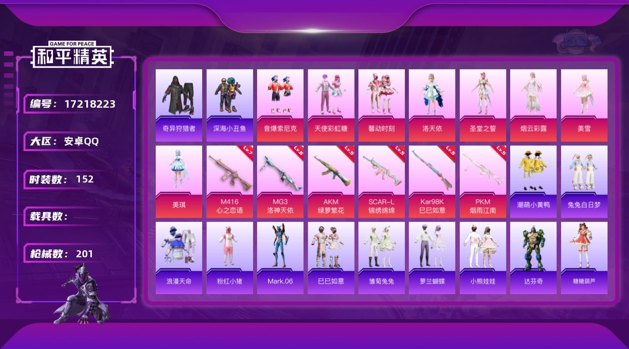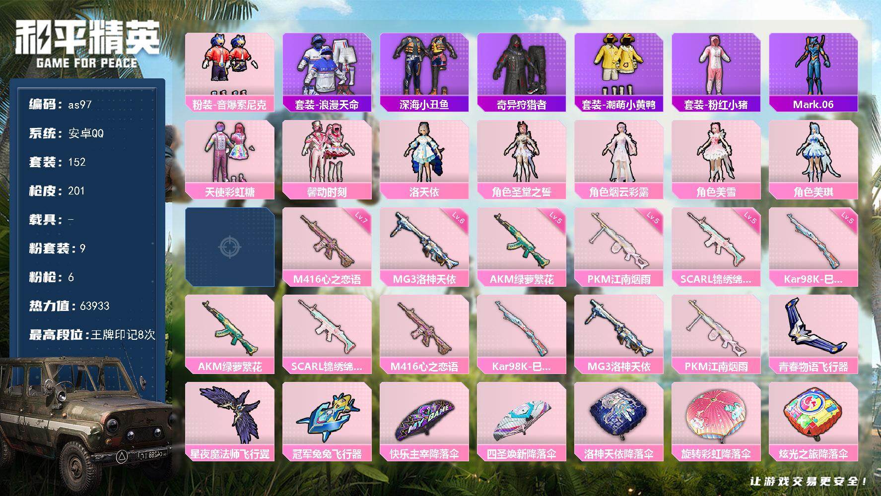 [17218223]安卓 手Q-9粉装-6特效枪-0载具-3粉色飞行器-63933热力值-8王牌印记-152套装-201枪皮
