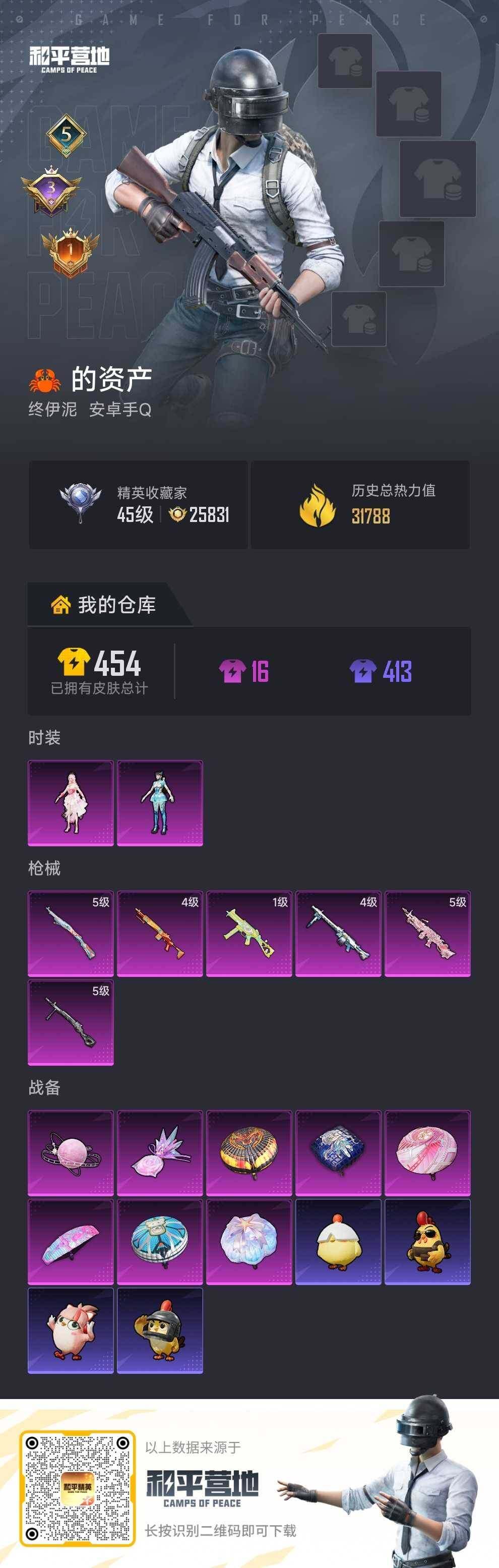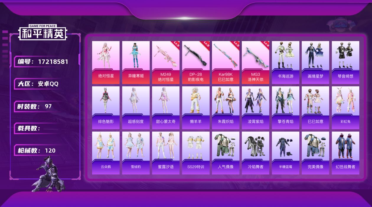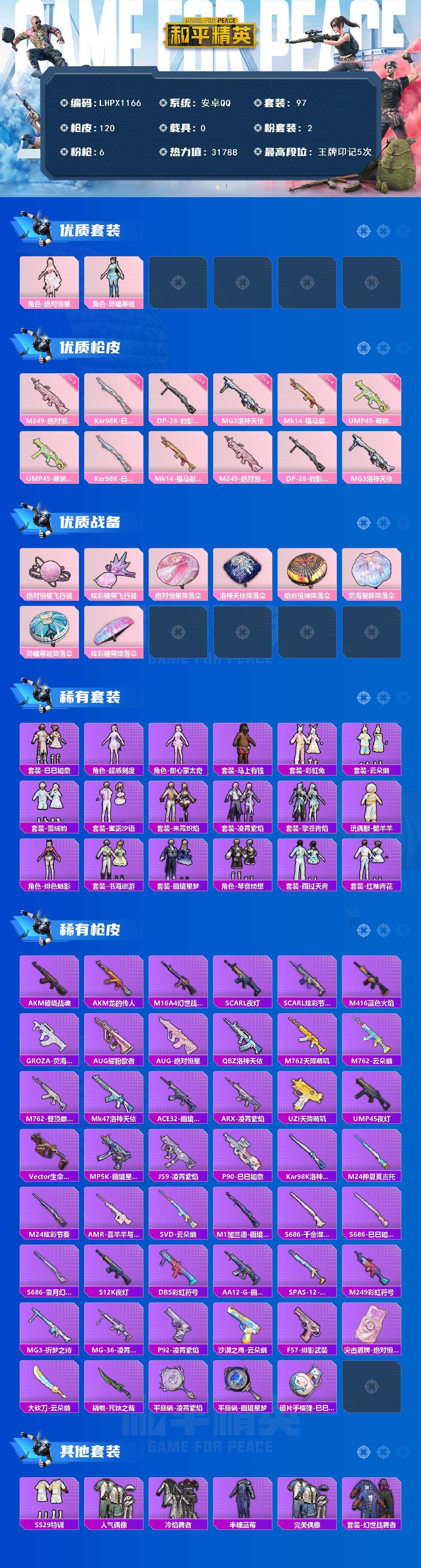 [17218581]可二次【特价出售/店主推荐】安卓 手Q-2粉装-6特效枪-0载具-2粉色飞行器-31788热力值-5王牌印记-97套装-120枪皮 【粉色套装】:角色-绝对恒星,角色-异瞳寒姬 【粉色枪皮等级】:UMP45-萌骑冒险(一级),Kar98K-巳巳如意(五级),Mk14-福马献瑞(四级),M249-绝对恒星(五级),DP-28-豹影疾电(五级),MG3-洛神天依(四级) 【粉色枪皮】:UMP45-萌骑冒险,Kar98K-巳巳如意,Mk14-福马献瑞,M249-绝对恒星,DP-28-豹影疾电,MG3-洛神天依 【粉色飞行器】:绝对恒星飞行器,炫彩糖果飞行器 【粉色降落伞】:绝对恒星降落伞,洛神天依降落伞,熔岩统帅降落伞,荧海星豚降落伞,异瞳寒姬降落伞,炫彩糖果降落伞 【稀有套装】:套装-巳巳如意,角色-超感刻度,角色-甜心蒙太奇,套装-雪国风尚,套装-炫彩糖果,套装-马上有钱,套装-彩虹兔,套装-云朵鹅,套装-雪绒豹,套装-蜜露汐语,套装-朱霞炽焰,套装-凌霄紫焰,套装-擎苍青焰,玩偶服-懒羊羊,角色-绯色魅影,套装-书海巡游,套装-画境星梦,套装-琴音绮想,套装-雨过天青,套装-红釉青花 【稀有枪皮】:AUG-冰晶雪宝,AKM-破晓战魂,AKM-龙的传人,M16A4-幻世战舞者,SCAR-L-夜灯,SCAR-L-炫彩节奏,M416-蓝色火焰,GROZA-荧海星豚,AUG-耀粉歌者,AUG-绝对恒星,QBZ-洛神天依,M762-天降萌叽,M762-云朵鹅,M762-登顶巅峰,Mk47-洛神天依,ACE32-画境星梦,ARX-凌霄紫焰,UZI-天降萌叽,UMP45-夜灯,Vector-生命誓言,MP5K-画境星梦,JS9-凌霄紫焰,P90-巳巳如意,Kar98K-洛神天依,M24-炫彩节奏,M24-仲夏莫吉托,AMR-喜羊羊与灰太狼,SVD-云朵鹅,M1加兰德-画境星梦,S686-雪月幻音,S686-巳巳如意,S686-千金淑猫,S12K-夜灯,DBS-彩虹符号,AA12-G-画境星梦,SPAS-12-云朵鹅,M249-彩虹符号,MG3-折梦之诗,MG-36-凌霄紫焰,P92-凌霄紫焰,沙漠之鹰-云朵鹅,F57-绯影武装,突击盾牌-绝对恒星,大砍刀-云朵鹅,撬棍-咒蚀之裁,平底锅-凌霄紫焰,平底锅-画境星梦,破片手榴弹-巳巳如意 【其他套装】:套装-SS29特训,套装-人