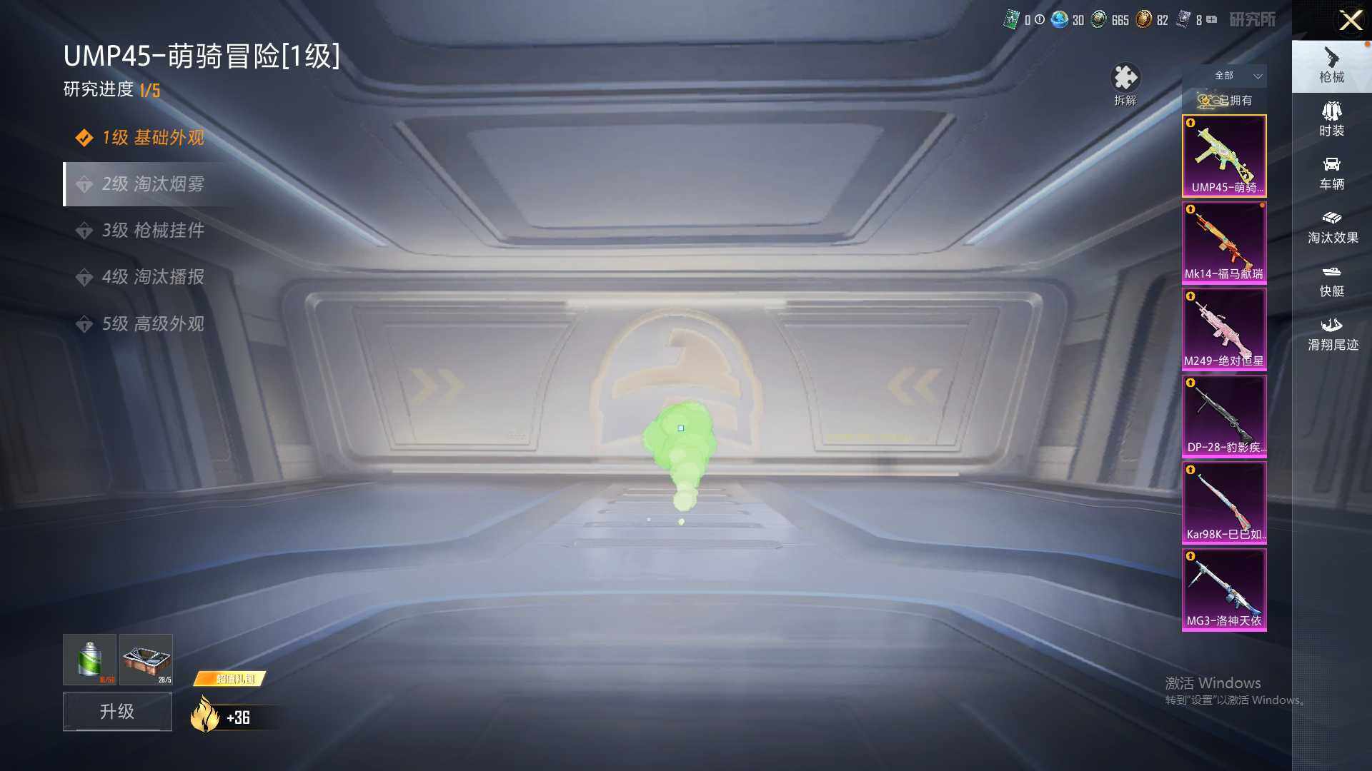 【粉色枪皮等级】:UMP45-萌骑冒险(一级),Kar98K-巳巳如意(五级),Mk14-福马献瑞(四级),M249-绝对恒星(五级),DP-28-豹影疾电(五级),MG3-洛神天依(四级)