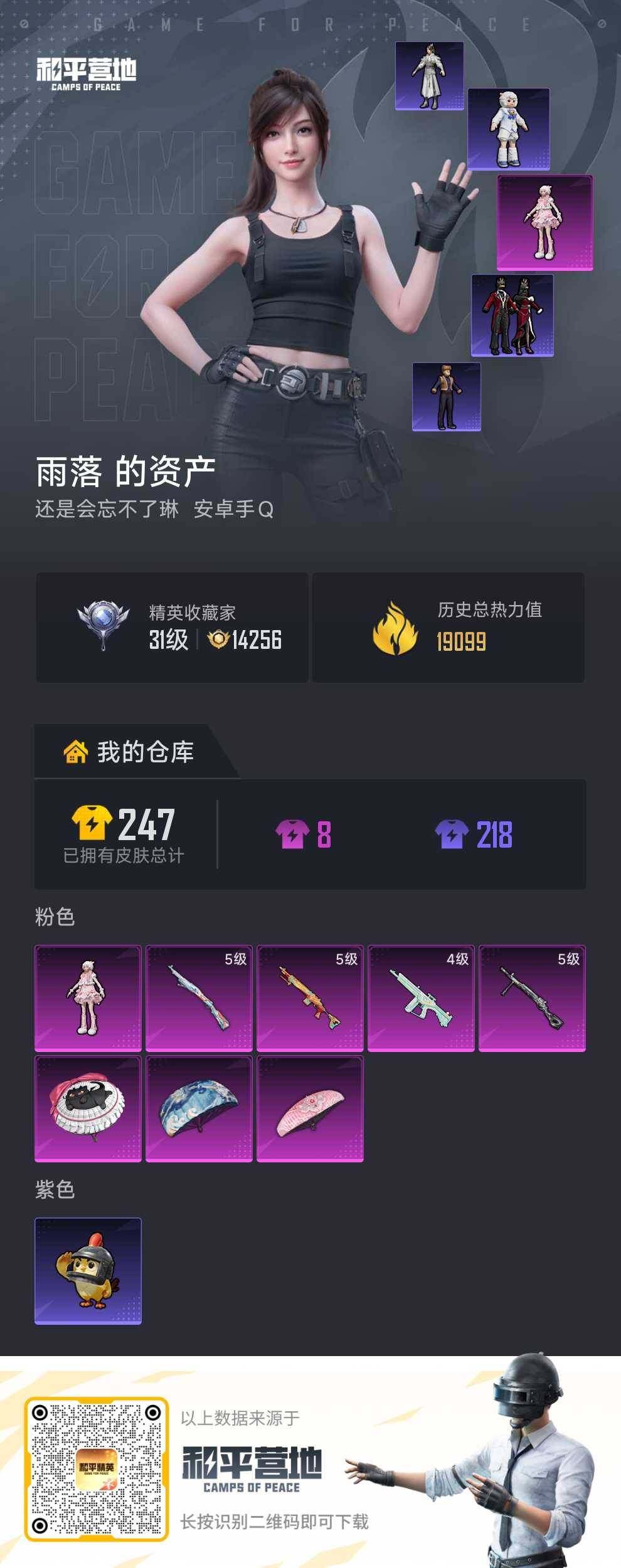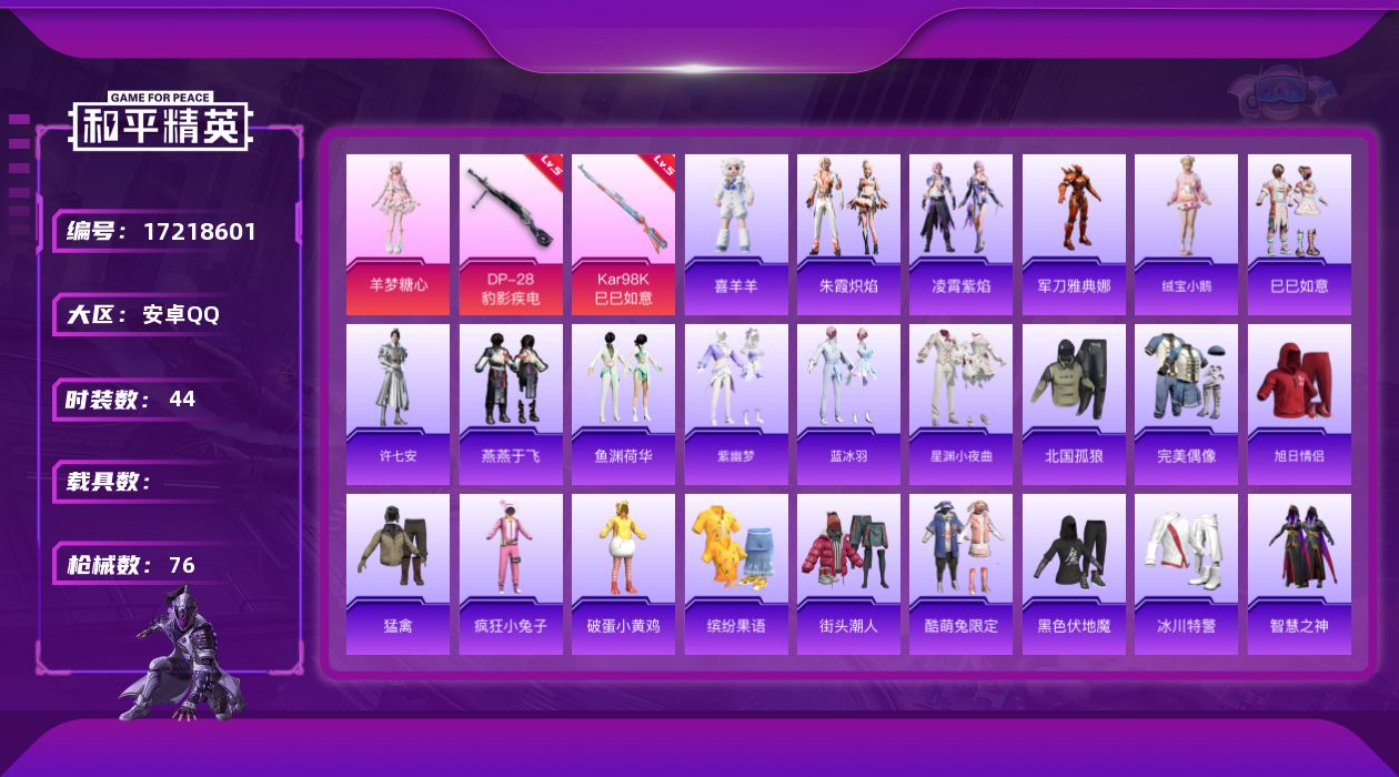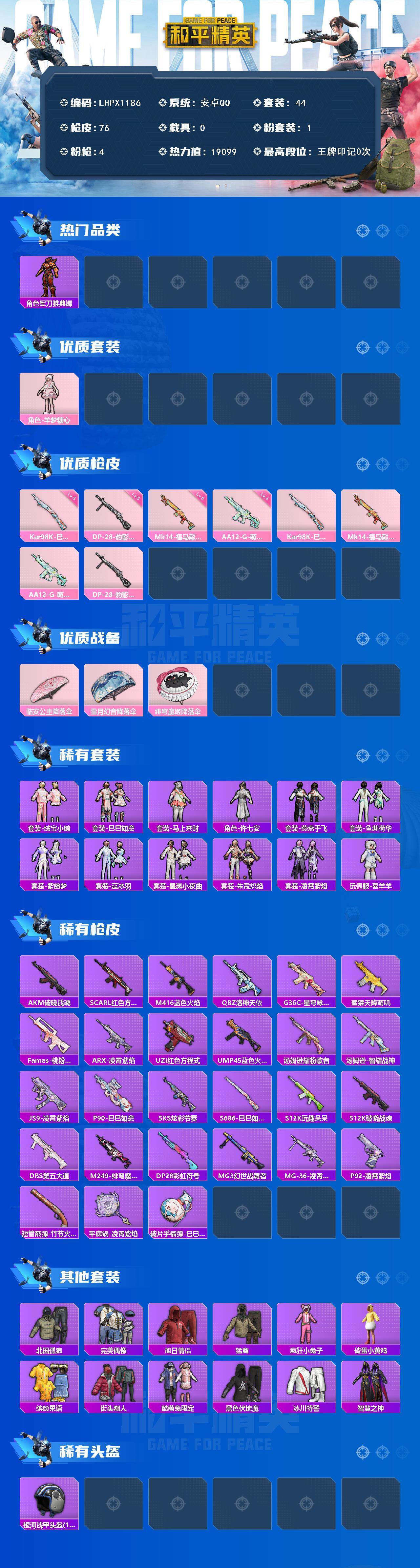 [17218601]【特价出售/店主推荐】安卓 手Q-1粉装-4特效枪-0载具-0粉色飞行器-19099热力值-2王牌印记-44套装-76枪皮 【热门品类】:角色-军刀雅典娜 【粉色套装】:角色-羊梦糖心 【粉色枪皮等级】:Kar98K-巳巳如意(五级),Mk14-福马献瑞(五级),AA12-G-萌骑幻想(四级),DP-28-豹影疾电(五级) 【粉色枪皮】:Kar98K-巳巳如意,Mk14-福马献瑞,AA12-G-萌骑幻想,DP-28-豹影疾电 【粉色降落伞】:临安公主降落伞,雪月幻音降落伞,绯穹魔姬降落伞 【稀有套装】:套装-绒宝小鹅,套装-巳巳如意,套装-马上来财,角色-许七安,套装-燕燕于飞,套装-鱼渊荷华,套装-紫幽梦,套装-蓝冰羽,套装-星渊小夜曲,套装-朱霞炽焰,套装-凌霄紫焰,玩偶服-喜羊羊 【稀有枪皮】:AKM-破晓战魂,SCAR-L-红色方程式,M416-蓝色火焰,QBZ-洛神天依,G36C-星穹咏叹调,蜜獾-天降萌叽,Famas-桃粉嫣然,ARX-凌霄紫焰,UZI-红色方程式,UMP45-蓝色火焰,汤姆逊-耀粉歌者,汤姆逊-智耀战神,JS9-凌霄紫焰,P90-巳巳如意,SKS-炫彩节奏,S686-巳巳如意,S12K-玩趣呆呆,S12K-破晓战魂,DBS-第五大道,M249-绯穹魔姬,DP-28-彩虹符号,MG3-幻世战舞者,MG-36-凌霄紫焰,P92-凌霄紫焰,短管霰弹-竹节火铳,平底锅-凌霄紫焰,破片手榴弹-巳巳如意 【其他套装】:套装-北国孤狼,套装-完美偶像,套装-旭日情侣,套装-猛禽,套装-疯狂小兔子,套装-破蛋小黄鸡,套装-缤纷果语,套装-街头潮人,套装-酷萌兔限定,套装-黑色伏地魔,套装-冰川特警,套装-智慧之神 【稀有头盔】:银河战甲头盔(1级) 【营地ID】:931393394
