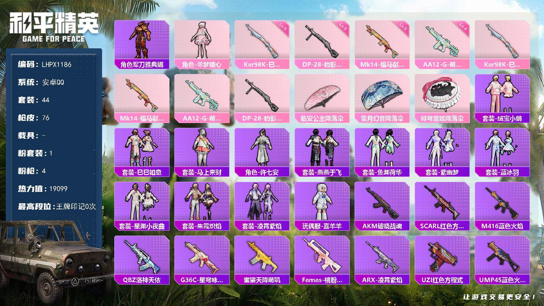 [17218601]【特价出售/店主推荐】安卓 手Q-1粉装-4特效枪-0载具-0粉色飞行器-19099热力值-2王牌印记-44套装-76枪皮