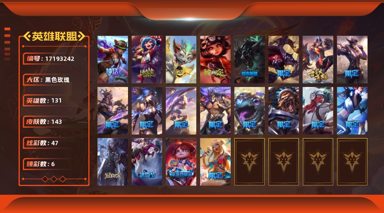 [17193242]未定级段位-131英雄-143皮肤-47炫彩-0终极-2神话-22限定-20传说-26史诗