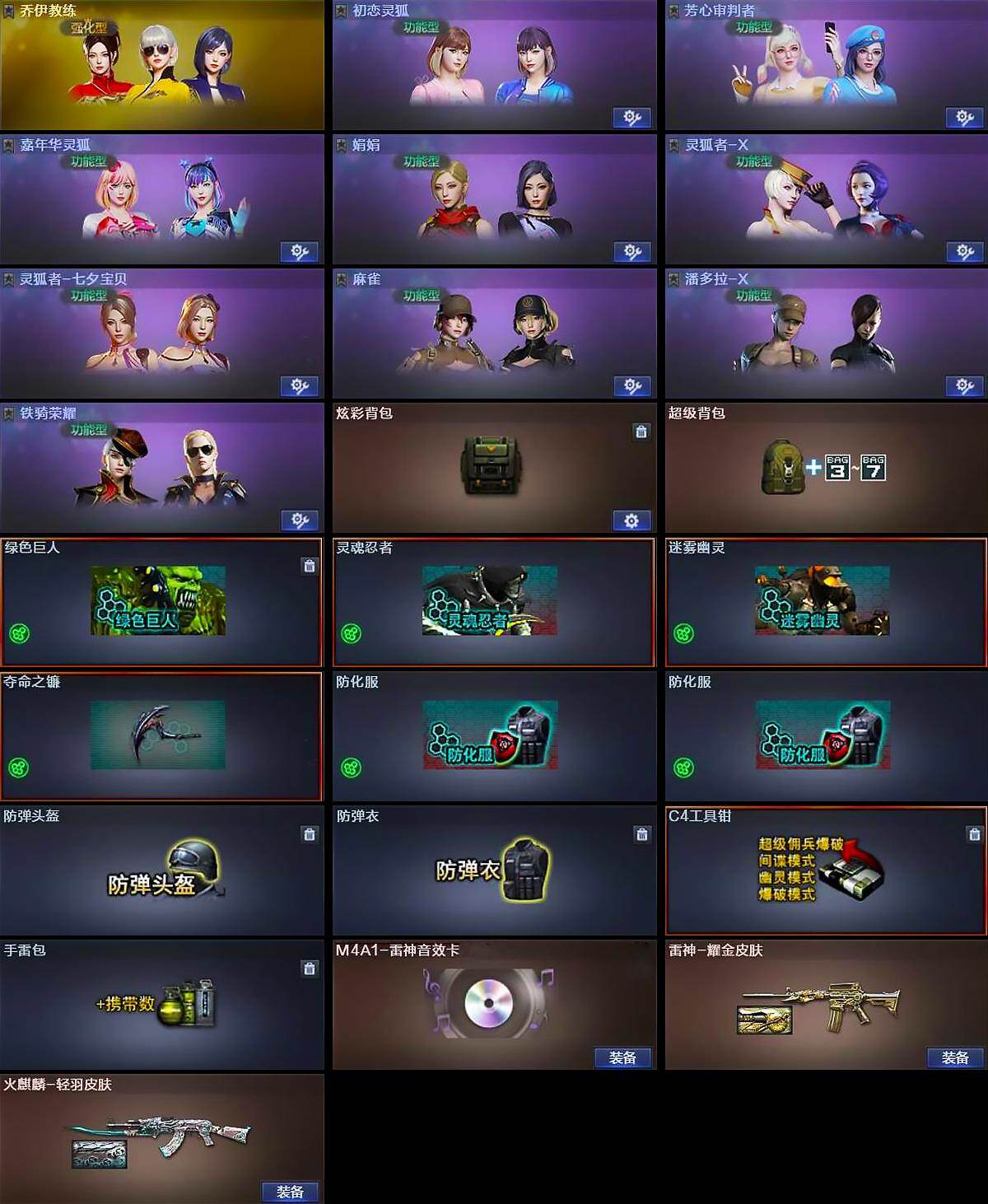 【道具】:炫彩背包,超级背包,绿色巨人,灵魂忍者,迷雾幽灵,夺命之镰,防化服*2,防弹头盔,防弹衣,C4工具钳,手雷包