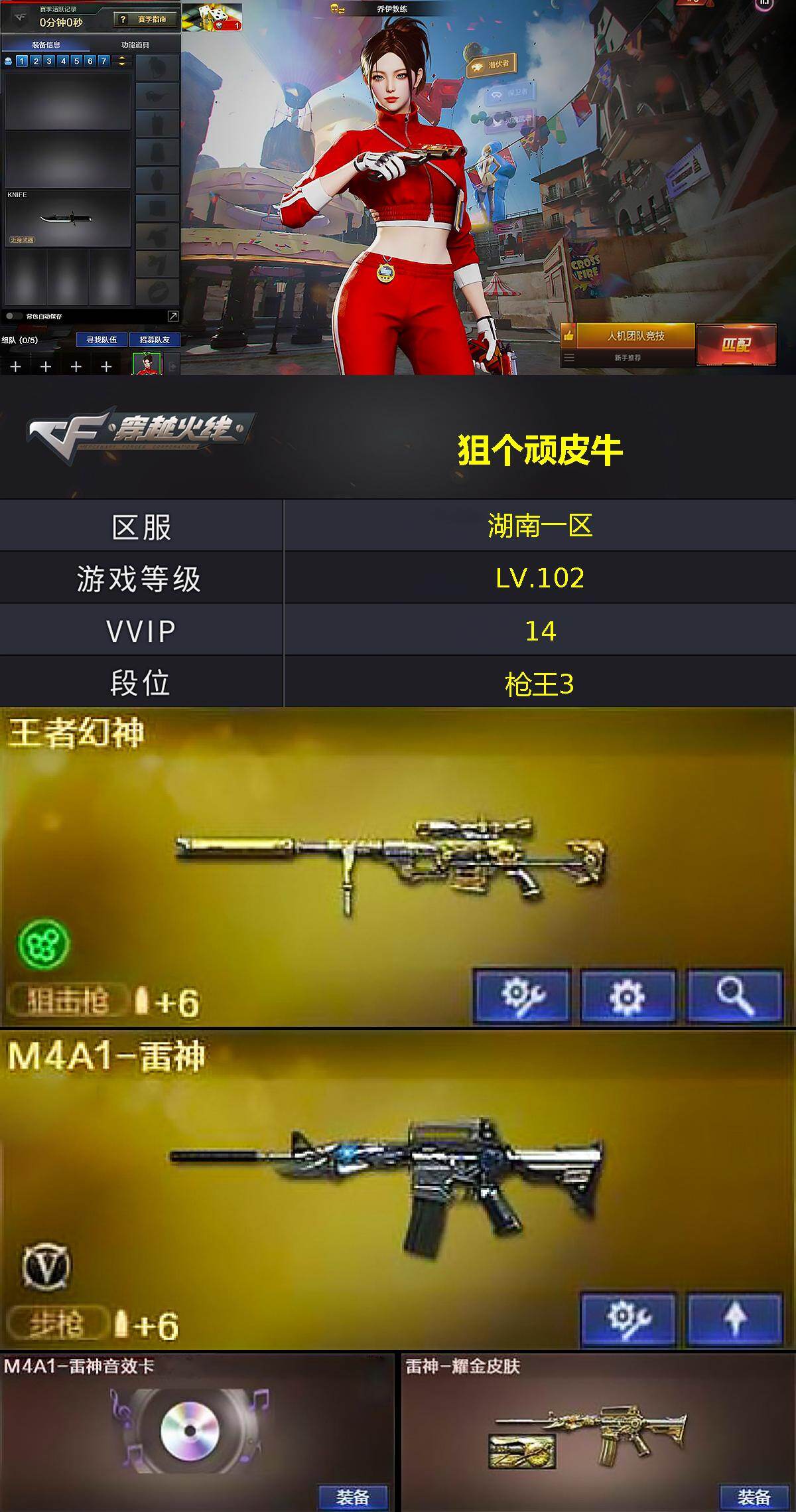 [17045171]湖南一区-15V-1王者武器数-1炫金武器数 【热门武器】:王者幻神 【王者炫金武器】:王者幻神,炫金骑士 【音效卡】:M4A1-雷神音效卡 【皮肤】:雷神-耀金皮肤,火麒麟-轻羽皮肤 【角色】:乔伊教练,初恋灵狐,芳心审判者,嘉年华灵狐,娟娟,灵狐者-X,灵狐者-七夕宝贝,麻雀,潘多拉-X,铁骑荣耀,兔囡囡 【人偶武器】:AWM-灵狐-15周年嘉年华,COP-旗袍,迷你深渊冰龙,夺魂,迷你牛牛,迷你艾比 【暴走生化】:超级对讲机 【挑战大师】:冰龙粉碎者-白马银枪,激光毁灭者III,神圣爆裂者-末日III 【英雄级武器】:AK47-火麒麟,M4A1-黑龙,M4A1-雷神,无影-神兵利器,黑武士-CF网剧冠军,Barrett-朱雀,沙鹰-天神,天神-CF网剧冠军,屠龙*2,龙啸,麒麟刺,擎天-CF网剧冠军 【道具】:炫彩背包,超级背包,绿色巨人,灵魂忍者,迷雾幽灵,夺命之镰,防化服*2,防弹头盔,防弹衣,C4工具钳,手雷包 【特殊枪械】: