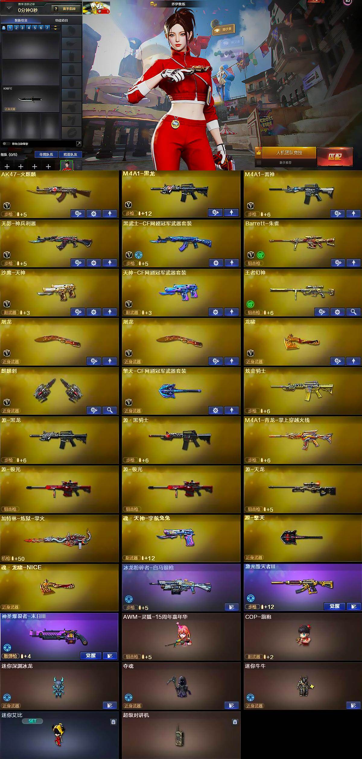 【英雄级武器】:AK47-火麒麟,M4A1-黑龙,M4A1-雷神,无影-神兵利器,黑武士-CF网剧冠军,Barrett-朱雀,沙鹰-天神,天神-CF网剧冠军,屠龙*2,龙啸,麒麟刺,擎天-CF网剧冠军