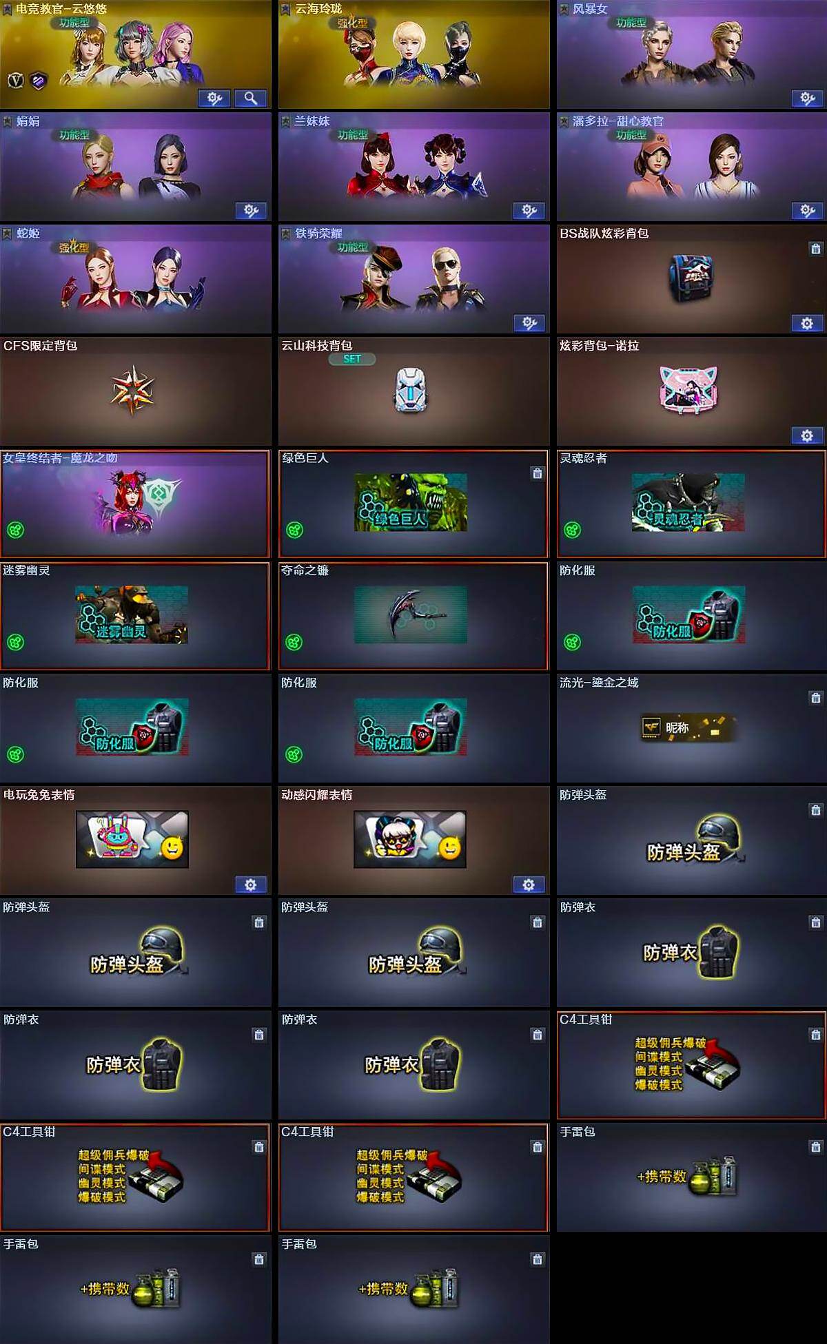 【道具】:BS战队炫彩背包,CFS限定背包,云山科技背包,炫彩背包-诺拉,哔哩哔哩名片,女皇终结者-魔龙之吻,绿色巨人,灵魂忍者,迷雾幽灵,夺命之镰,防化服*3,流光-鎏金之域,电玩兔兔表情,动感闪耀表情,防弹头盔*3,防弹衣*3,C4工具钳*3,手雷包*3