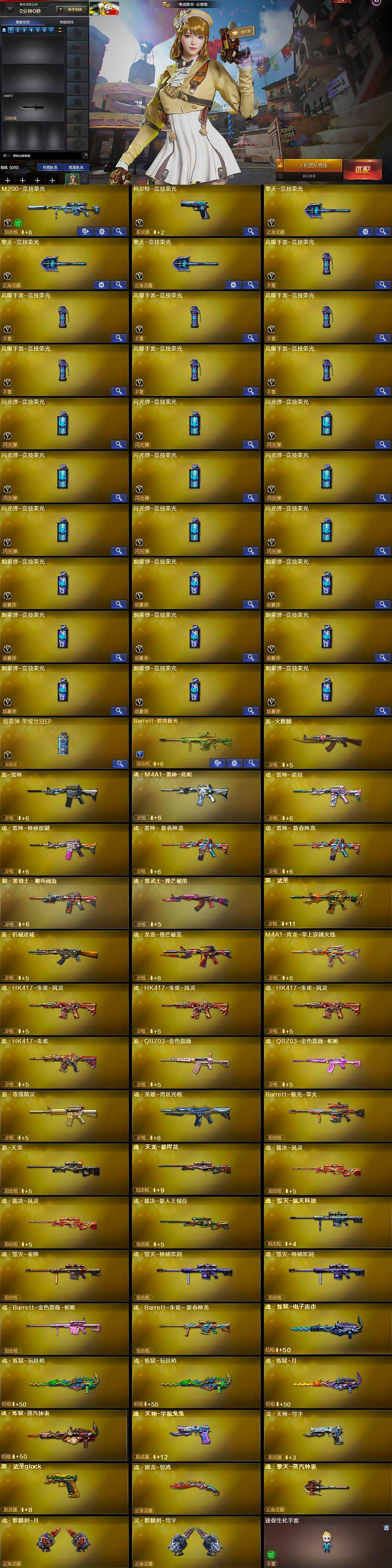 【英雄级武器】:M200-竞技荣光,柯尔特-竞技荣光,擎天-竞技荣光*3,高爆手雷-竞技荣光*7,闪光弹-竞技荣光*9,烟雾弹-竞技荣光*9,烟雾弹-荣耀世冠EP,Barrett-碧霄极光
