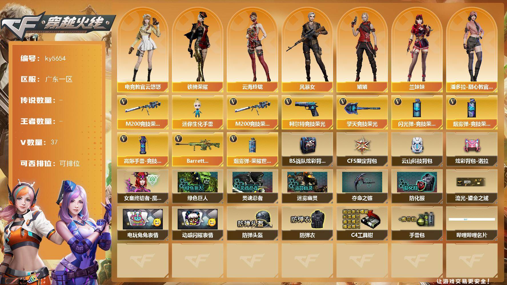 [16995583]广东一区-37V-0王者武器数-0炫金武器数 【热门武器】:M200-竞技荣光 【角色】:电竞教官-云悠悠,云海玲珑,风暴女,娟娟,兰妹妹,潘多拉-甜心教官,蛇姬,铁骑荣耀 【人偶武器】:迷你生化手雷 【英雄级武器】:M200-竞技荣光,柯尔特-竞技荣光,擎天-竞技荣光*3,高爆手雷-竞技荣光*7,闪光弹-竞技荣光*9,烟雾弹-竞技荣光*9,烟雾弹-荣耀世冠EP,Barrett-碧霄极光 【道具】:BS战队炫彩背包,CFS限定背包,云山科技背包,炫彩背包-诺拉,哔哩哔哩名片,女皇终结者-魔龙之吻,绿色巨人,灵魂忍者,迷雾幽灵,夺命之镰,防化服*3,流光-鎏金之域,电玩兔兔表情,动感闪耀表情,防弹头盔*3,防弹衣*3,C4工具钳*3,手雷包*3 【特殊枪械】:
