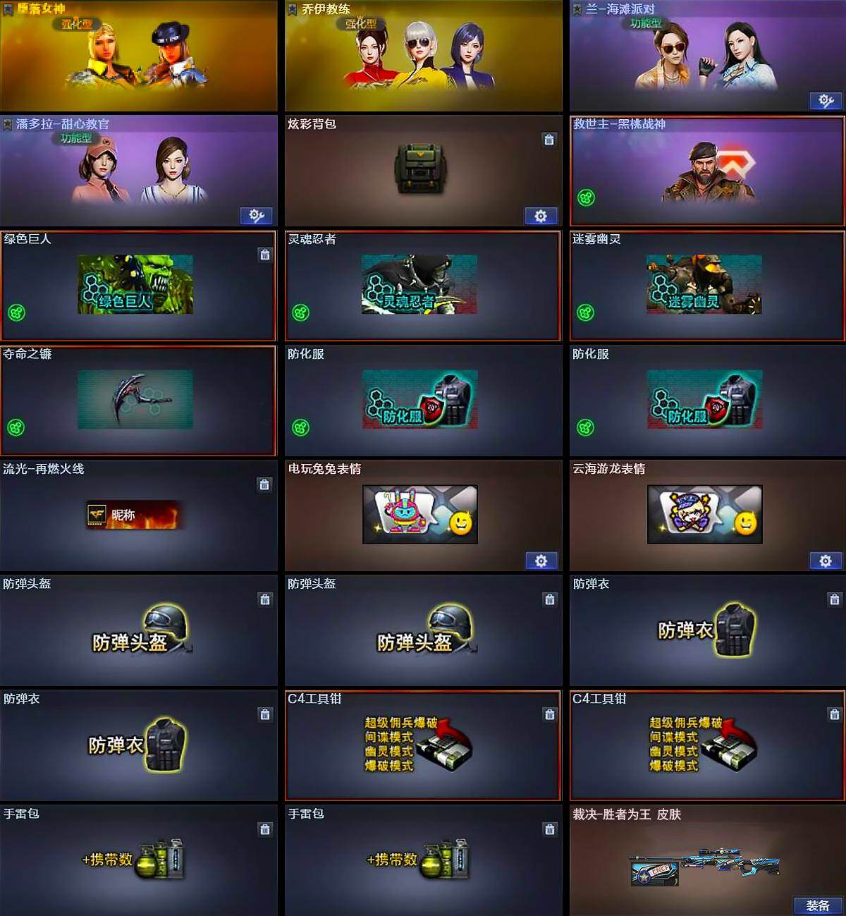【道具】:炫彩背包,救世主-黑桃战神,绿色巨人,灵魂忍者,迷雾幽灵,夺命之镰,防化服*2,流光-再燃火线,电玩兔兔表情,云海游龙表情,防弹头盔*2,防弹衣*2,C4工具钳*2,手雷包*2